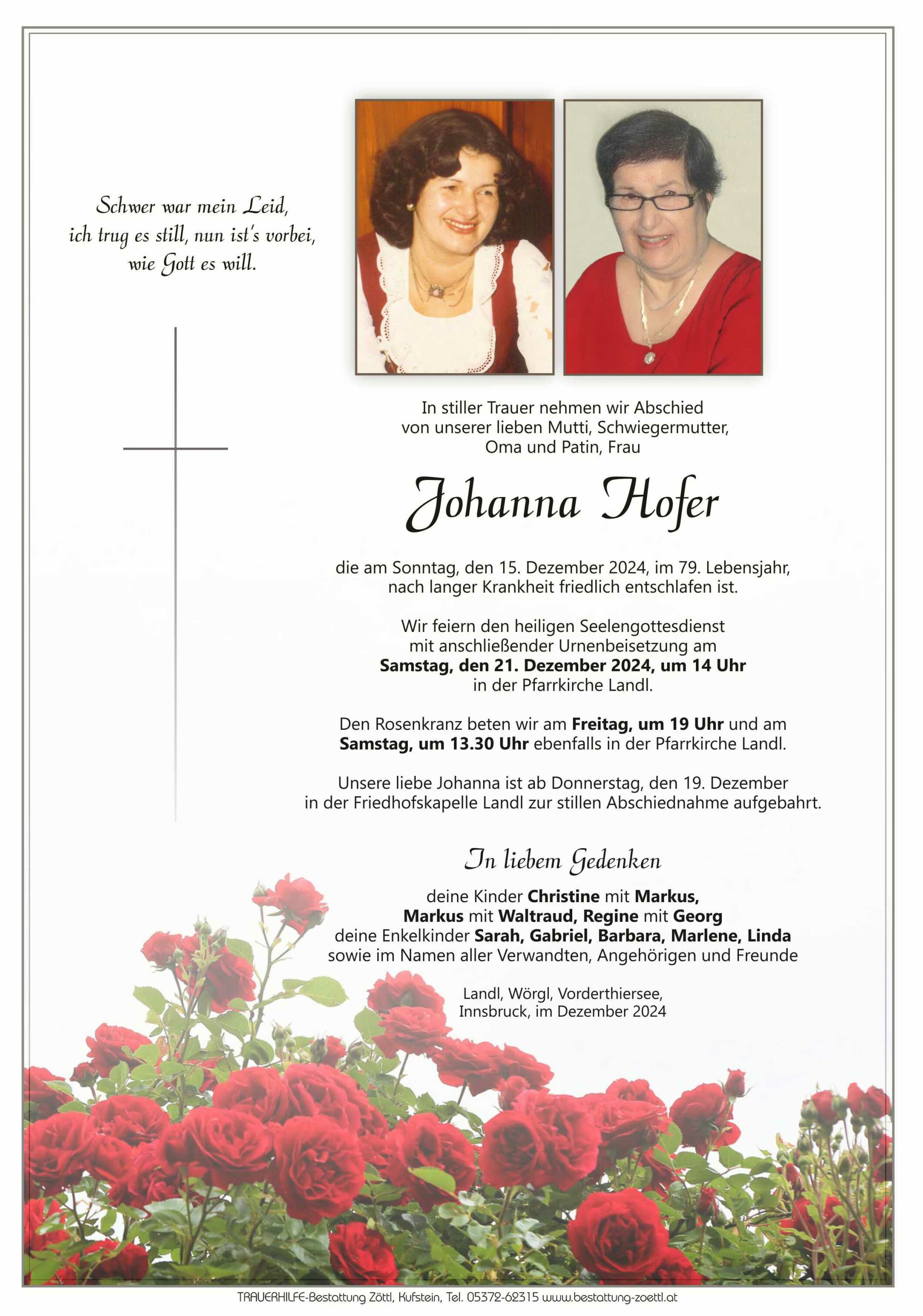 Ich habe deine Mutter sehr geschätzt. Sie hat soviel Positives und Gutes für die Gemeinschaft geleistet: angefangen bei den Passionsspielen als bildhübsche Römerin, über ihre große Sorge und Mühe für euch und ihre geduldige Pflegearbeit für ihre Schwiegereltern und ihre eigene Mutter bis hin zu ihrer treuen Arbeit für die Pfarre Landl.