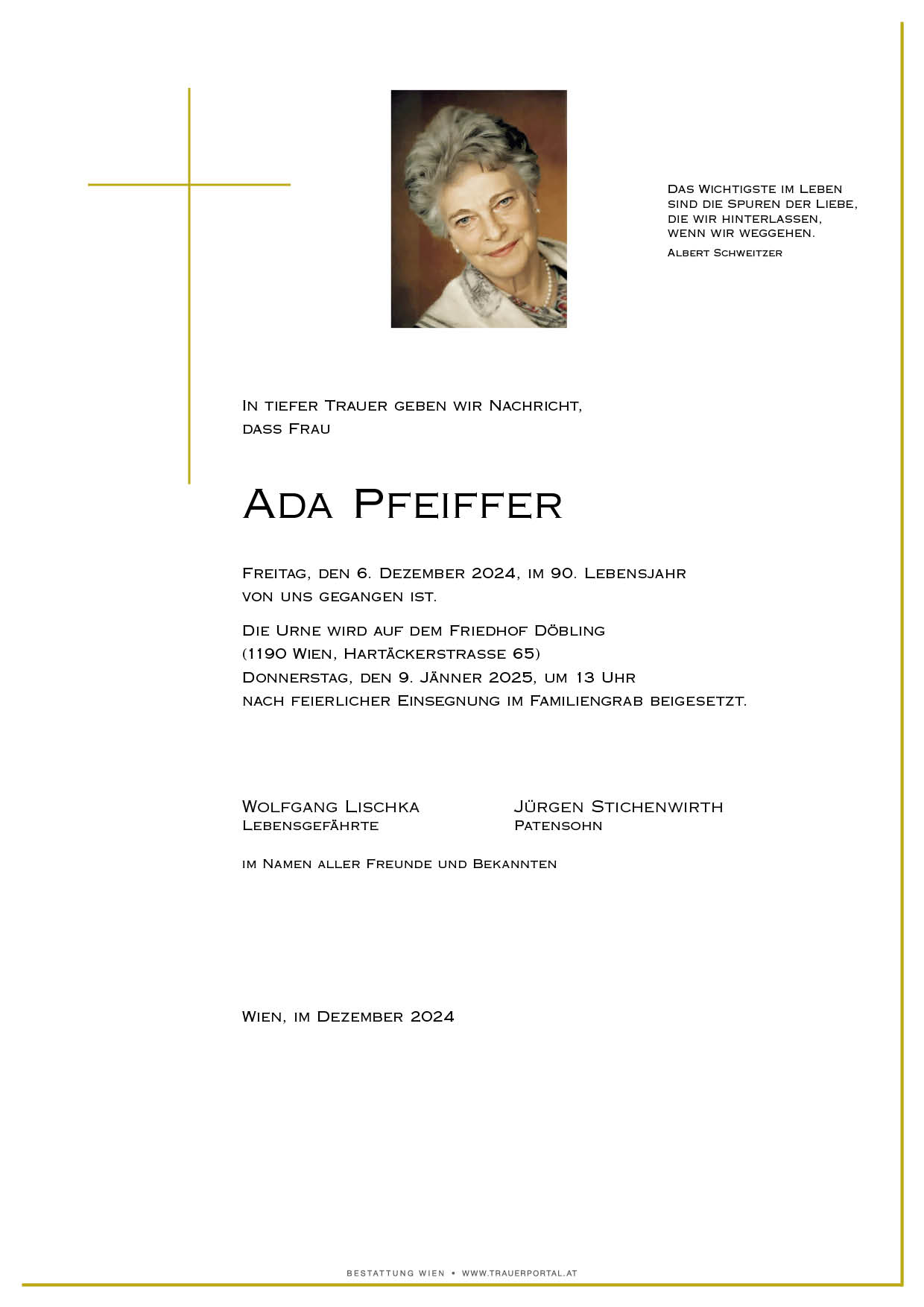 Bestattung wurde durchgeführt von: Bestattung Wien Bestattung Wien GmbH Simmeringer Hauptstraße 339 1110 - Wien (Simmering) Tel.: 01 501950 zum Bestatter