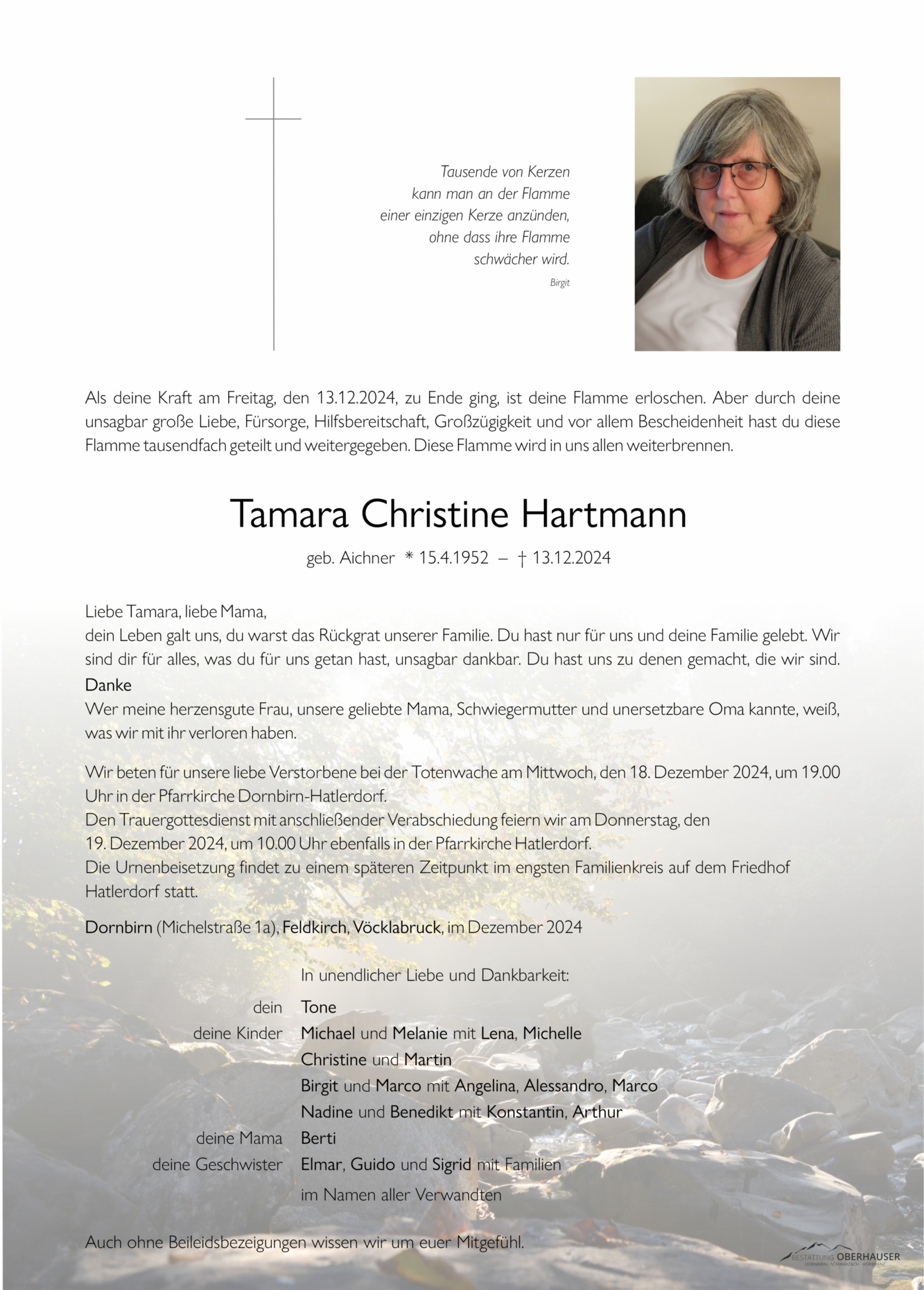 Neue Kerze für Tamara Christine Hartmann entzünden.