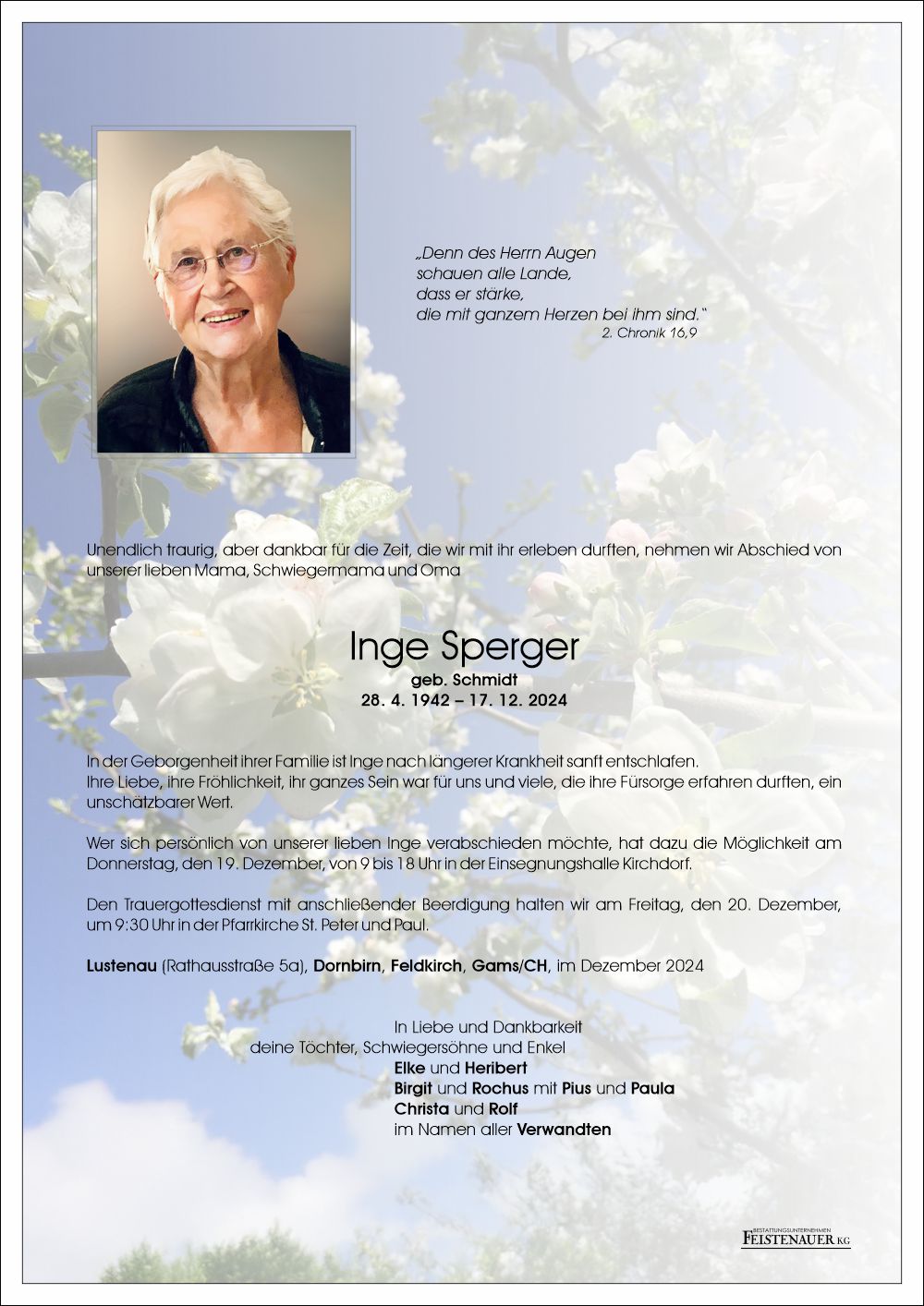 Bestattung wurde durchgeführt von: Angelika Matheisl Bestattung Feistenauer Holzstraße 54 6890 - Lustenau Tel.: 05577 87100 zum Bestatter