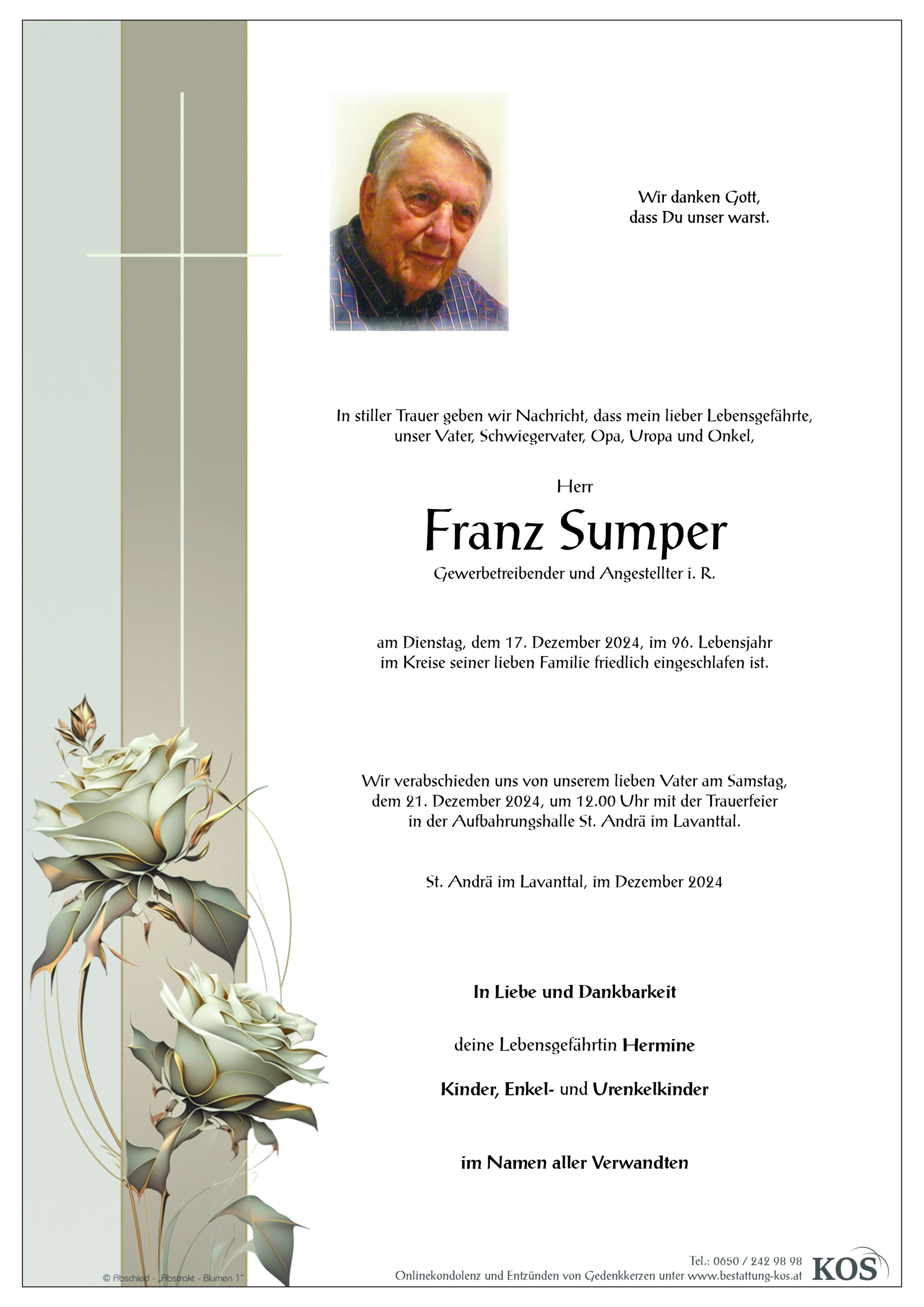 Bestattung wurde durchgeführt von: Familienbetrieb Bestattung Kos Bestattung A. & J. Kos GmbH Krankenhausstraße 2A 9400 - Wolfsberg Tel.: 0650 242 98 98 zum Bestatter