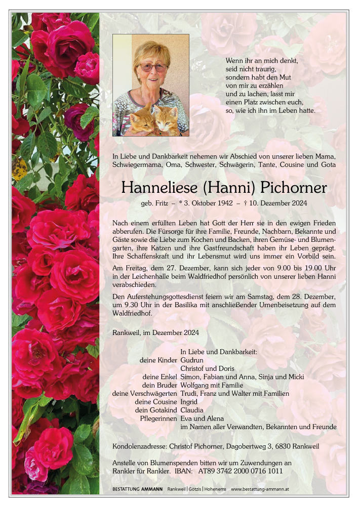 Bestattung wurde durchgeführt von: Bestattung Ammann Rankweil Ammann Bestattung GmbH Rankweil Splügenweg 1 6830 - Rankweil Tel.: 05522 42104 zum Bestatter