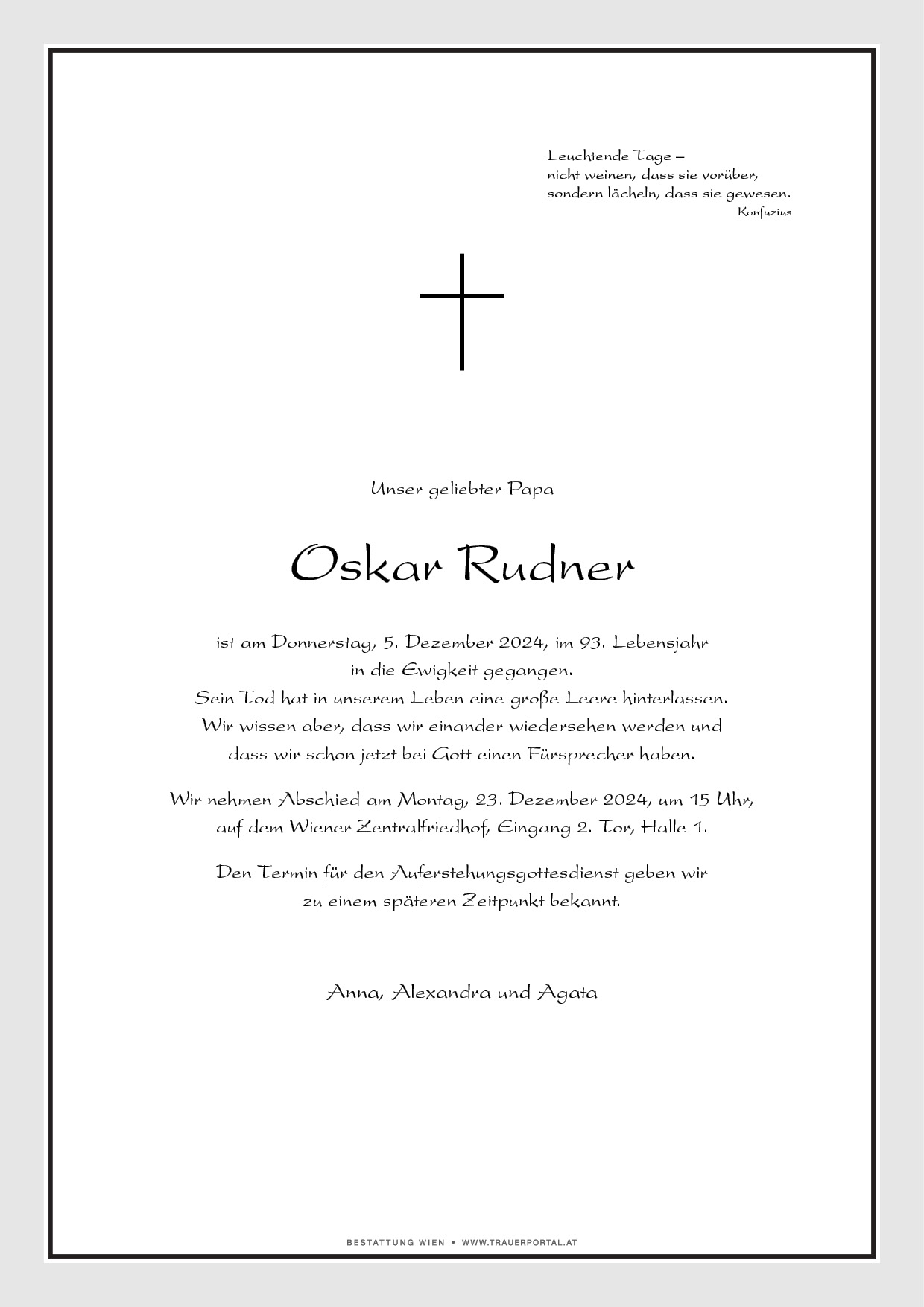 Bestattung wurde durchgeführt von: Bestattung Wien Bestattung Wien GmbH Simmeringer Hauptstraße 339 1110 - Wien (Simmering) Tel.: 01 501950 zum Bestatter