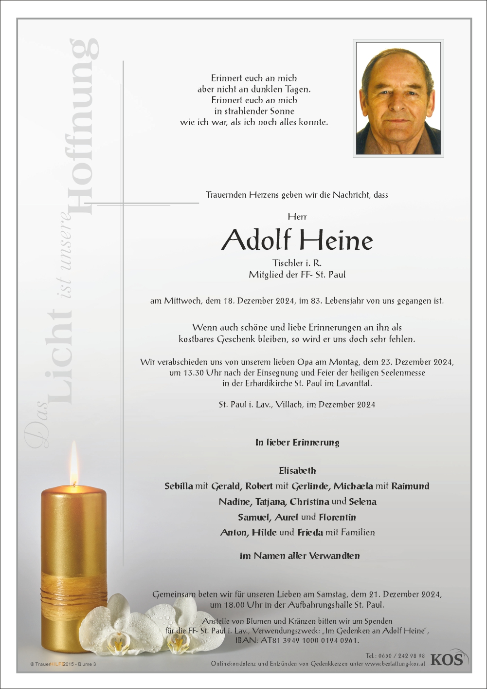 Neue Kerze für Adolf Heine entzünden.