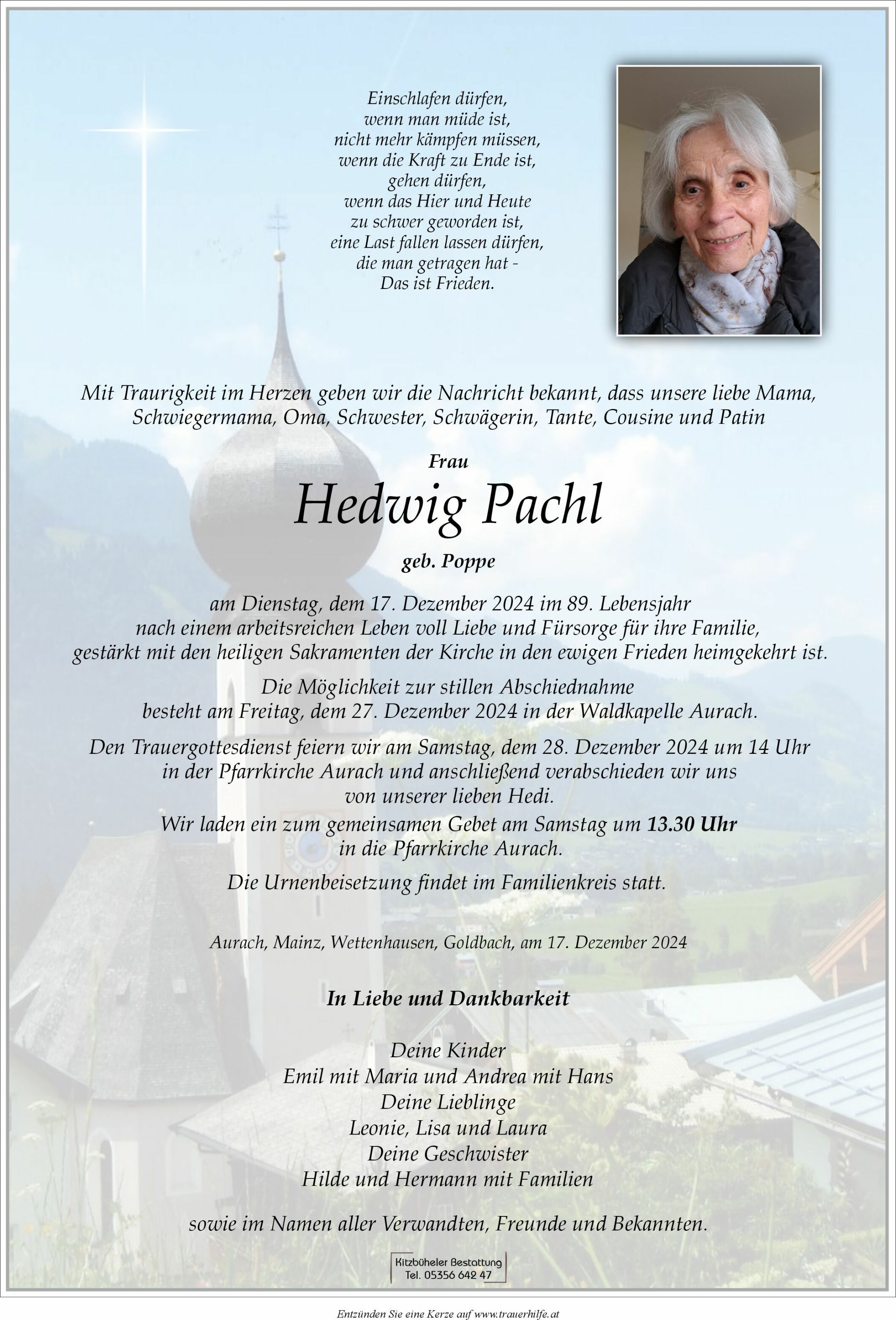 Bestattung wurde durchgeführt von: Kitzbüheler Bestattung Kitzbüheler Bestattung Kitzbüheler Bestattung WV GmbH Jochberger Straße 62 6370 - Kitzbühel Tel.: 05356 642 47 Tel.: 050 1717 180 zum Bestatter