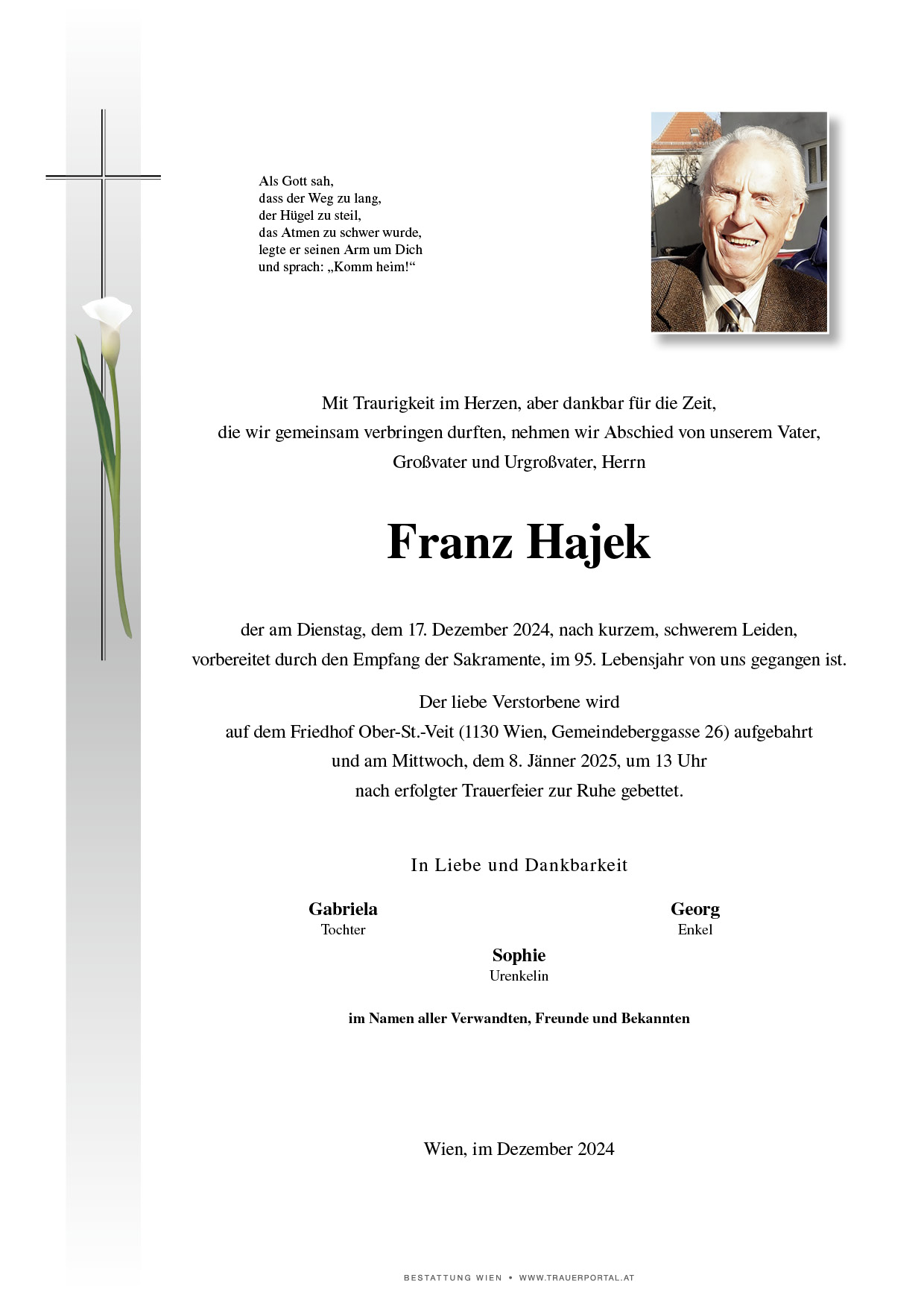 Bestattung wurde durchgeführt von: Bestattung Wien Bestattung Wien GmbH Simmeringer Hauptstraße 339 1110 - Wien (Simmering) Tel.: 01 501950 zum Bestatter
