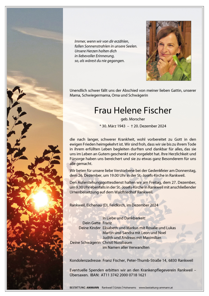 Bestattung wurde durchgeführt von: Bestattung Ammann Rankweil Ammann Bestattung GmbH Rankweil Splügenweg 1 6830 - Rankweil Tel.: 05522 42104 zum Bestatter