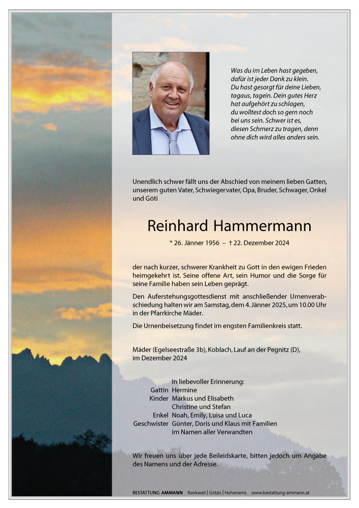Bestattung wurde durchgeführt von: Bestattung Ammann Rankweil Ammann Bestattung GmbH Rankweil Splügenweg 1 6830 - Rankweil Tel.: 05522 42104 zum Bestatter