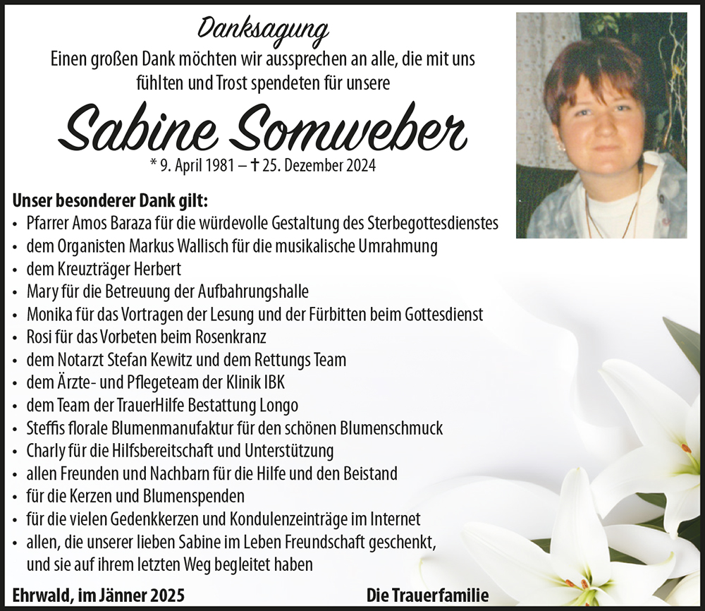 In tiefer Betroffenheit möchten wir euch auf diesem Wege unser aufrichtiges Beileid entbieten. Erst vor ein paar Wochen habe ich eure liebe Sabine vor der Schule getroffen und wir haben uns eine Weile unterhalten. Wir haben uns beide gefreut dass wir uns nach so langer Zeit wieder mal getroffen haben. Ich hätte mir nie gedacht, dass dies das letzte Wiedersehen sein würde, was mich sehr traurig stimmt. Es bleibt uns nur euch zu wünschen dass eure schönen Erinnerungen an Sabine euch in der schweren Zeit der Trauer und des Loslassens Kraft und Trost spenden.