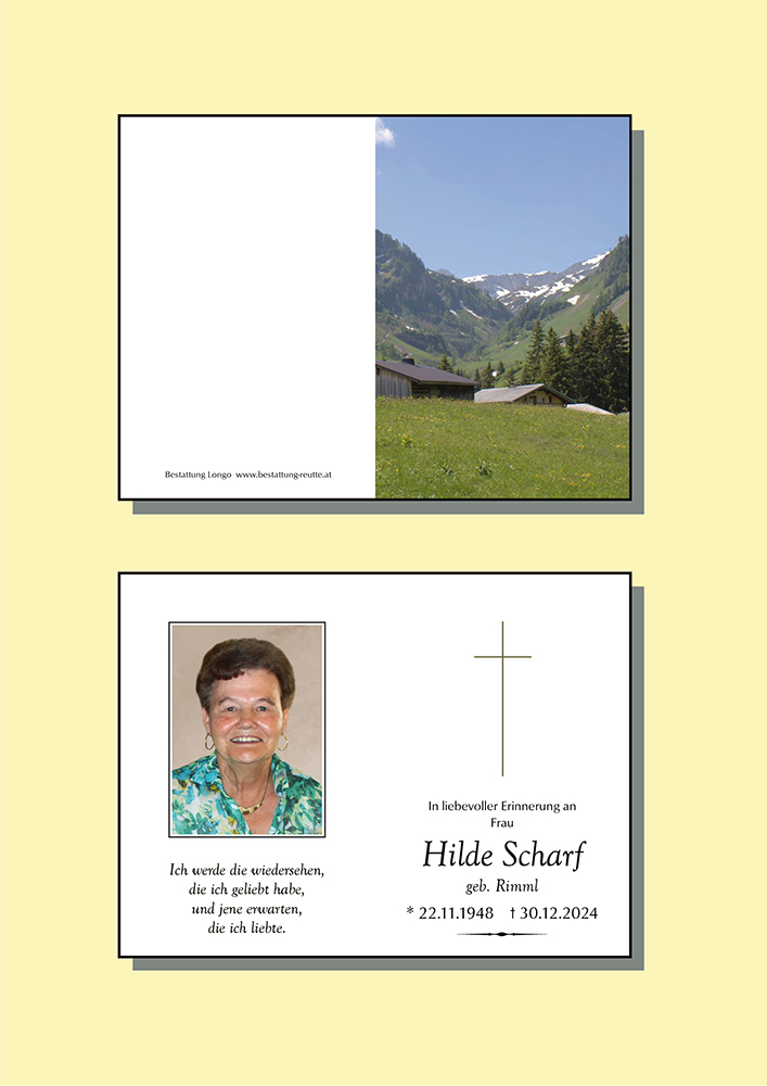 Hilde Scharf: Weint nicht um mich weil ich nicht mehr da bin, sondern freut euch mit mir dass ich endlich frei und schmerzfrei bin . Viele Menschen werden 100 Jahre Jahre alt und hatten dennoch kein erfülltes Leben, weil ihr Leben geprägt war von unzufriedenheit und dem streben nach immer mehr . Aber ich konnte mich immer Kleinigkeiten freuen und habe mein Leben genauso wie es war geliebt, ich konnte mich über die Blumen im Garten freuen ,über den Gesang der Vögel und war dankbar für mein Leben genauso wie es war. Ich hatte einen fleissigen ,treuen,wundervollen Ehemann und drei wundervolle Kinder und viele weitere Menschen die mein Leben bereichert haben .Ich blicke dankbar zurück und hatte ein erfülltes Leben und wenn ich jetzt im Himmel angekommen bin dann ist es nur ein Abschied auf Zeit, denn ich glaube daran dass wir uns eines Tages alle wieder sehen.