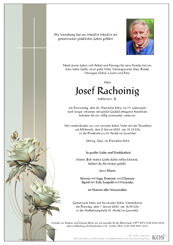 Bestattung wurde durchgeführt von: Familienbetrieb Bestattung Kos Bestattung A. & J. Kos GmbH Krankenhausstraße 2A 9400 - Wolfsberg Tel.: 0650 242 98 98 zum Bestatter