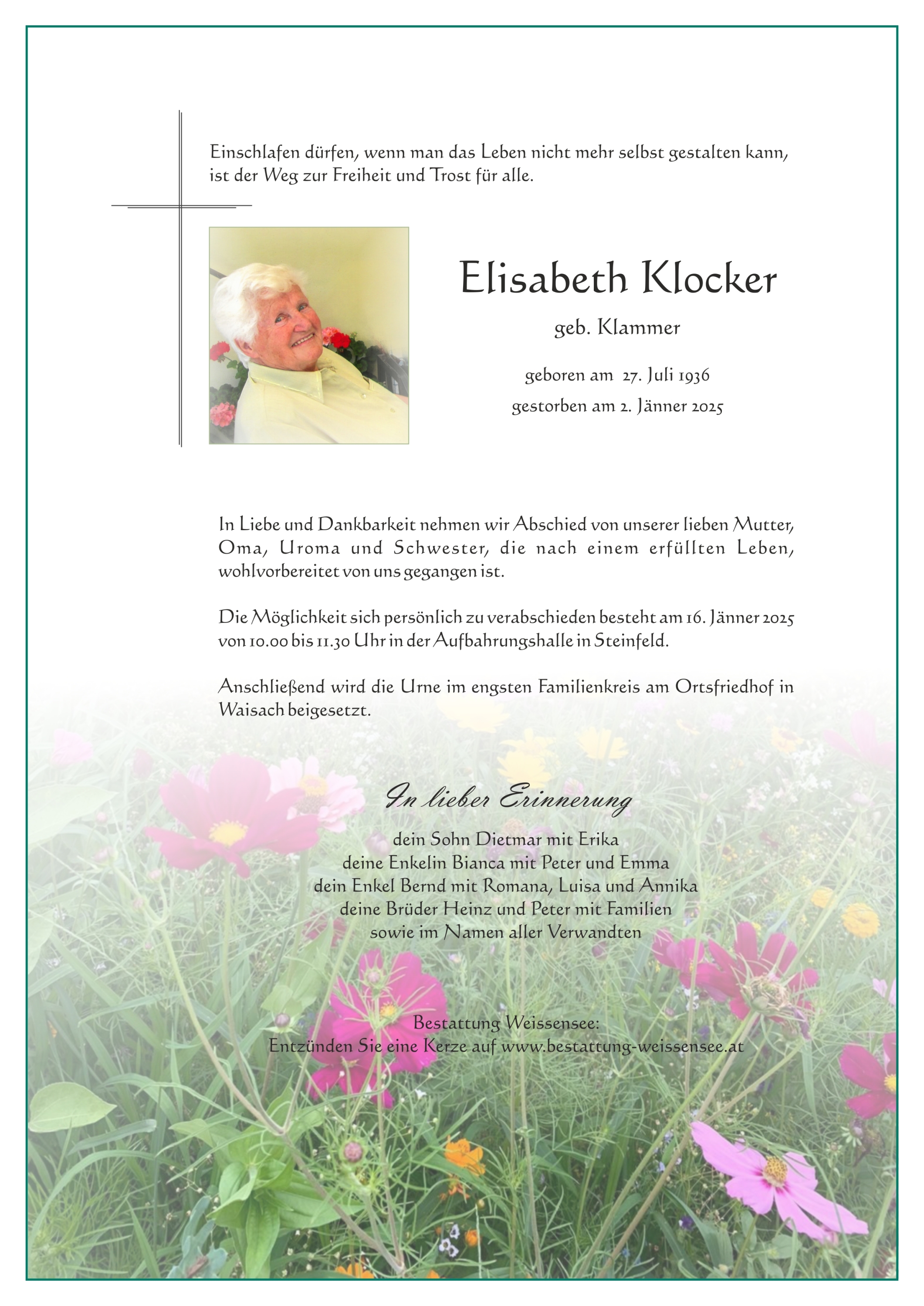 mein herzliches Beileid - es ist immer traurig die Mutter zu verlieren, auch wenn sie ein hohes Alter erreicht hat. Ich habe öfters nette Worte mit Frau Klocker gewechselt, als sie auf dem Weg zum Garten war. Ich werde sie in guter Erinnerung behalten.