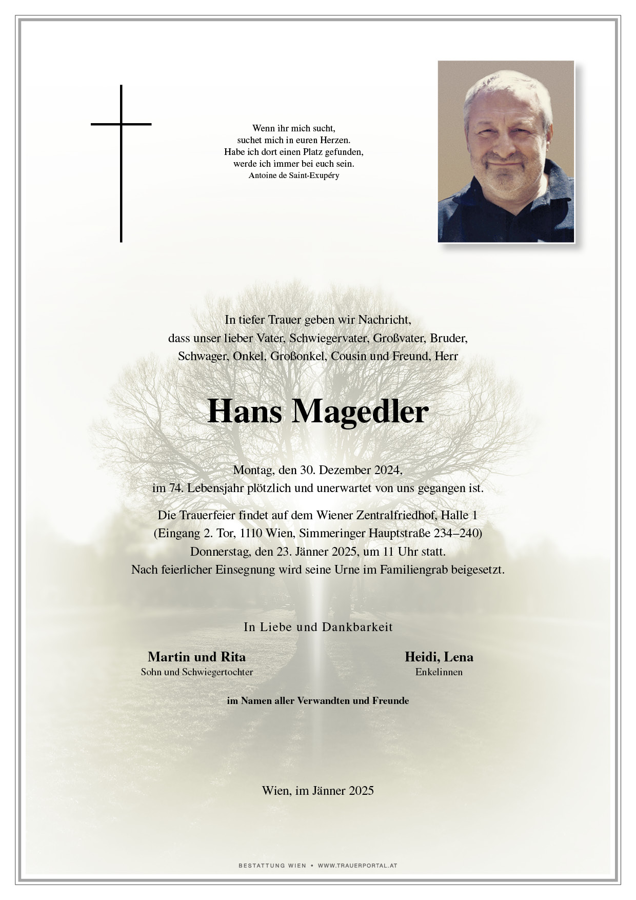 Ich denke oft an unsere gemeinsamen Heurigen-Nachmittage beim Gausterer und Hofstätter in Guntramsdorf. Es war immer nett, lustig und manchmal auch traurig, zuerst mit euch, und dann mit dir alleine. Ich hoffe Gaby, Franz und du, lieber Hans sitzt nun gemeinsam auf einer Wolke mit einem Glaserl Sekt in der Hand und lässt die schönen Zeiten Revue passieren.