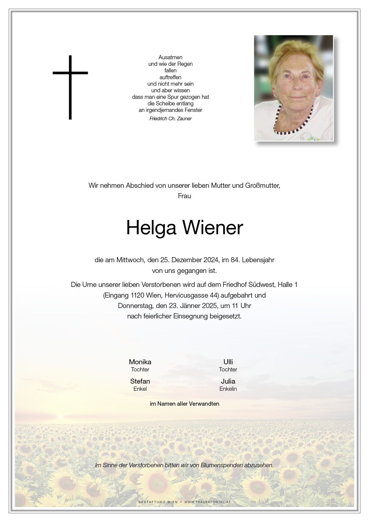 Bestattung wurde durchgeführt von: Bestattung Wien Bestattung Wien GmbH Simmeringer Hauptstraße 339 1110 - Wien (Simmering) Tel.: 01 501950 zum Bestatter