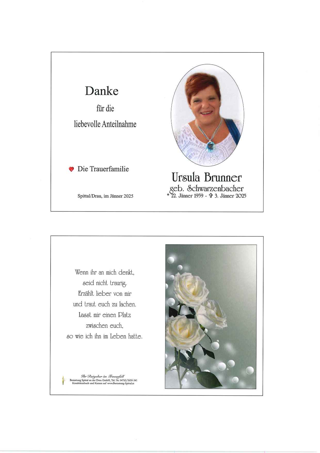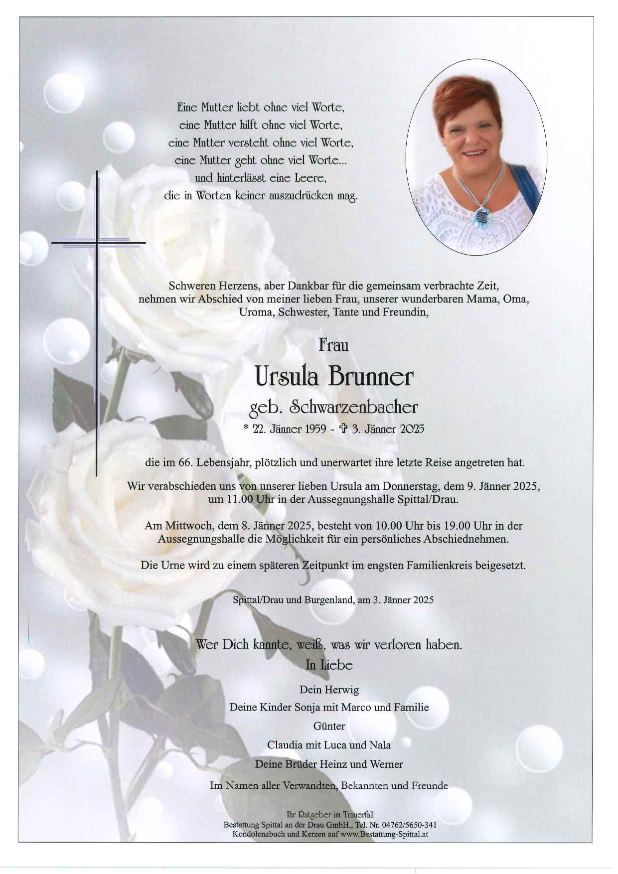 Bestattung wurde durchgeführt von: Gerald Baumgartner/Franz Kramaritsch/Sylvia Wippl Gerald Baumgartner/Franz Kramaritsch/Sylvia Wippl Städtische Bestattungsanstalt Spittal an der Drau Edlinger Straße 55 9800 - Spittal an der Drau Tel.: 04762 5650341 zum Bestatter