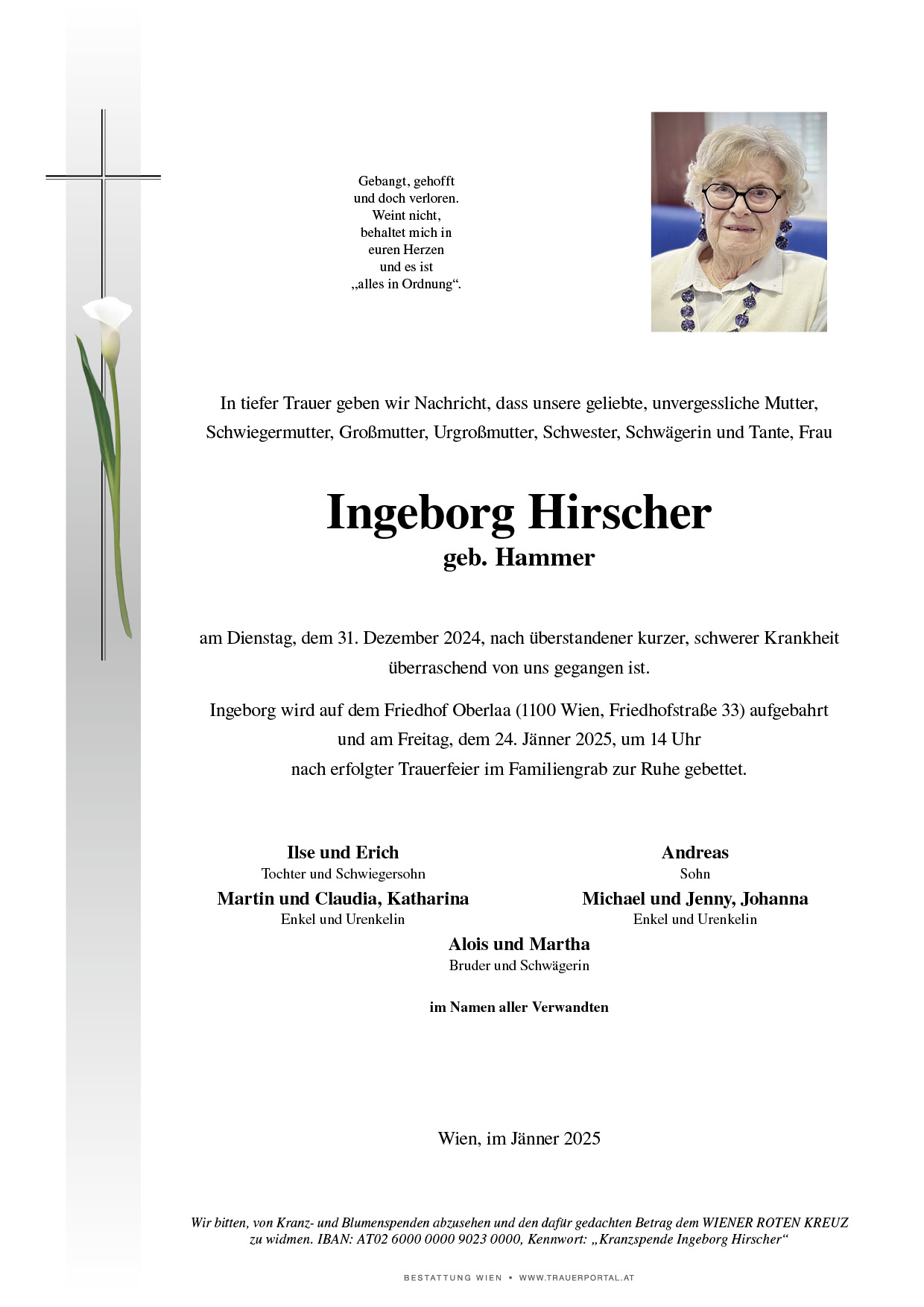 Neue Kerze für Ingeborg Hirscher entzünden.