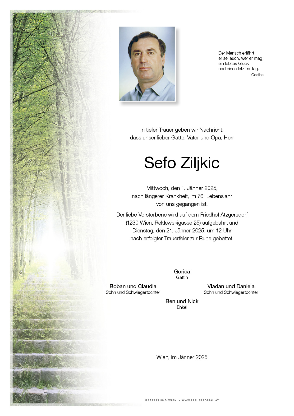 Bestattung wurde durchgeführt von: Bestattung Wien Bestattung Wien GmbH Simmeringer Hauptstraße 339 1110 - Wien (Simmering) Tel.: 01 501950 zum Bestatter