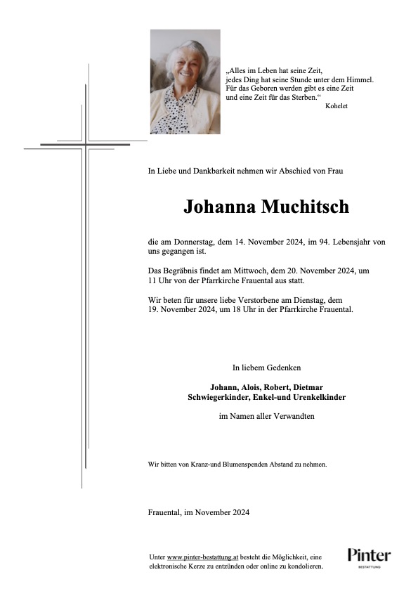 Bestattung wurde durchgeführt von: Pinter GmbH Pinter GmbH Nelkengasse 1-3 8530 - Deutschlandsberg Tel.: +43 3462 2907 zum Bestatter
