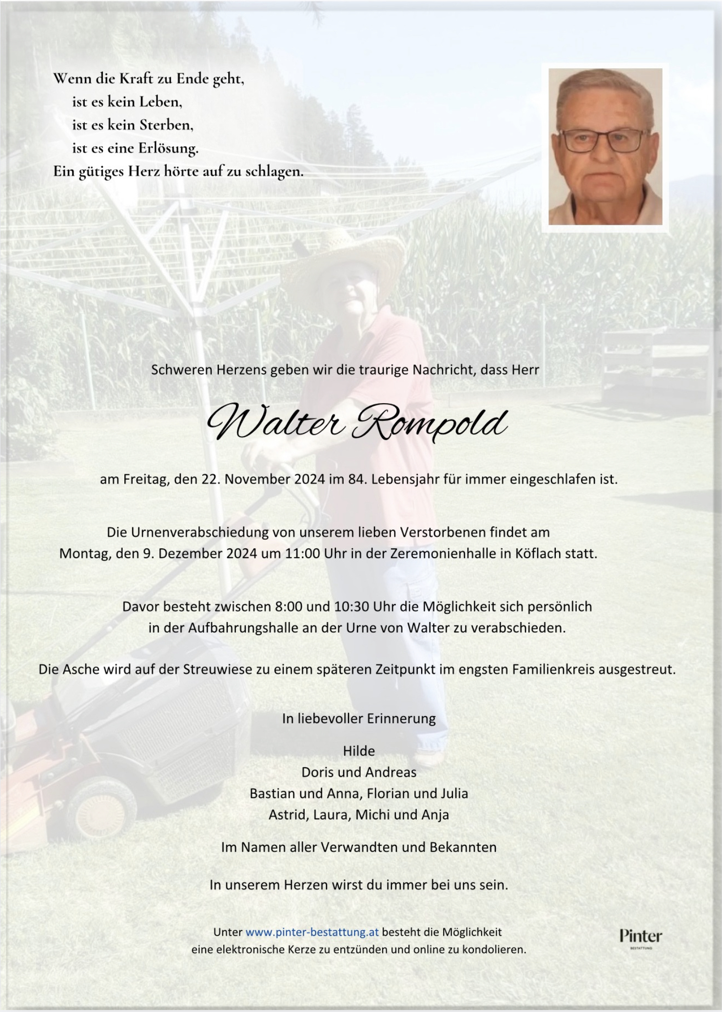Bestattung wurde durchgeführt von: Pinter GmbH Pinter GmbH Nelkengasse 1-3 8530 - Deutschlandsberg Tel.: +43 3462 2907 zum Bestatter