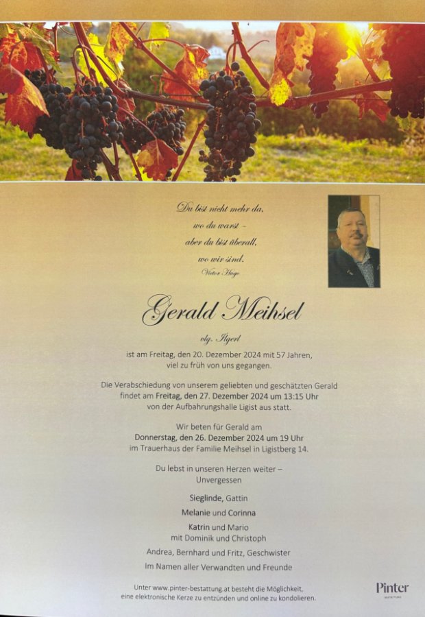 Bestattung wurde durchgeführt von: Pinter GmbH Pinter GmbH Nelkengasse 1-3 8530 - Deutschlandsberg Tel.: +43 3462 2907 zum Bestatter