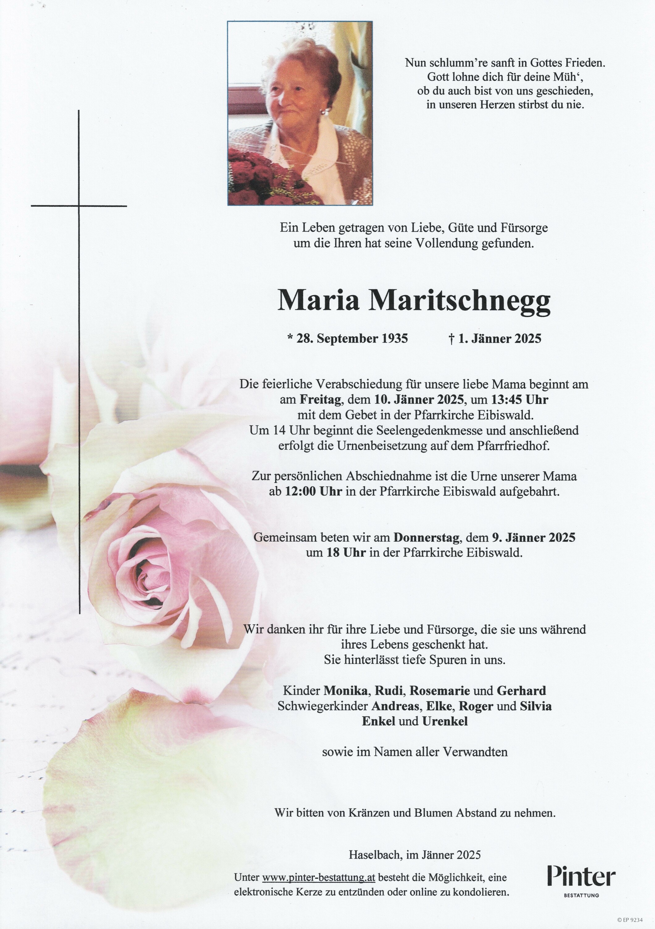 Bestattung wurde durchgeführt von: Pinter GmbH Pinter GmbH Nelkengasse 1-3 8530 - Deutschlandsberg Tel.: +43 3462 2907 zum Bestatter