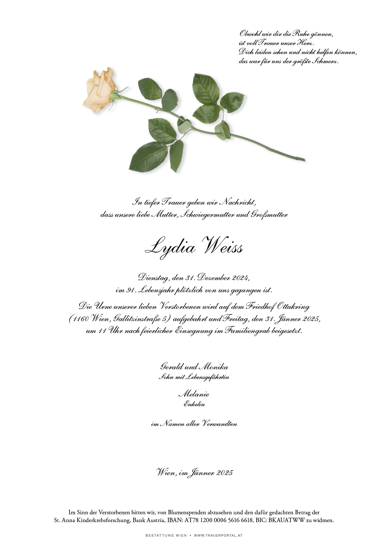 Bestattung wurde durchgeführt von: Bestattung Wien Bestattung Wien GmbH Simmeringer Hauptstraße 339 1110 - Wien (Simmering) Tel.: 01 501950 zum Bestatter
