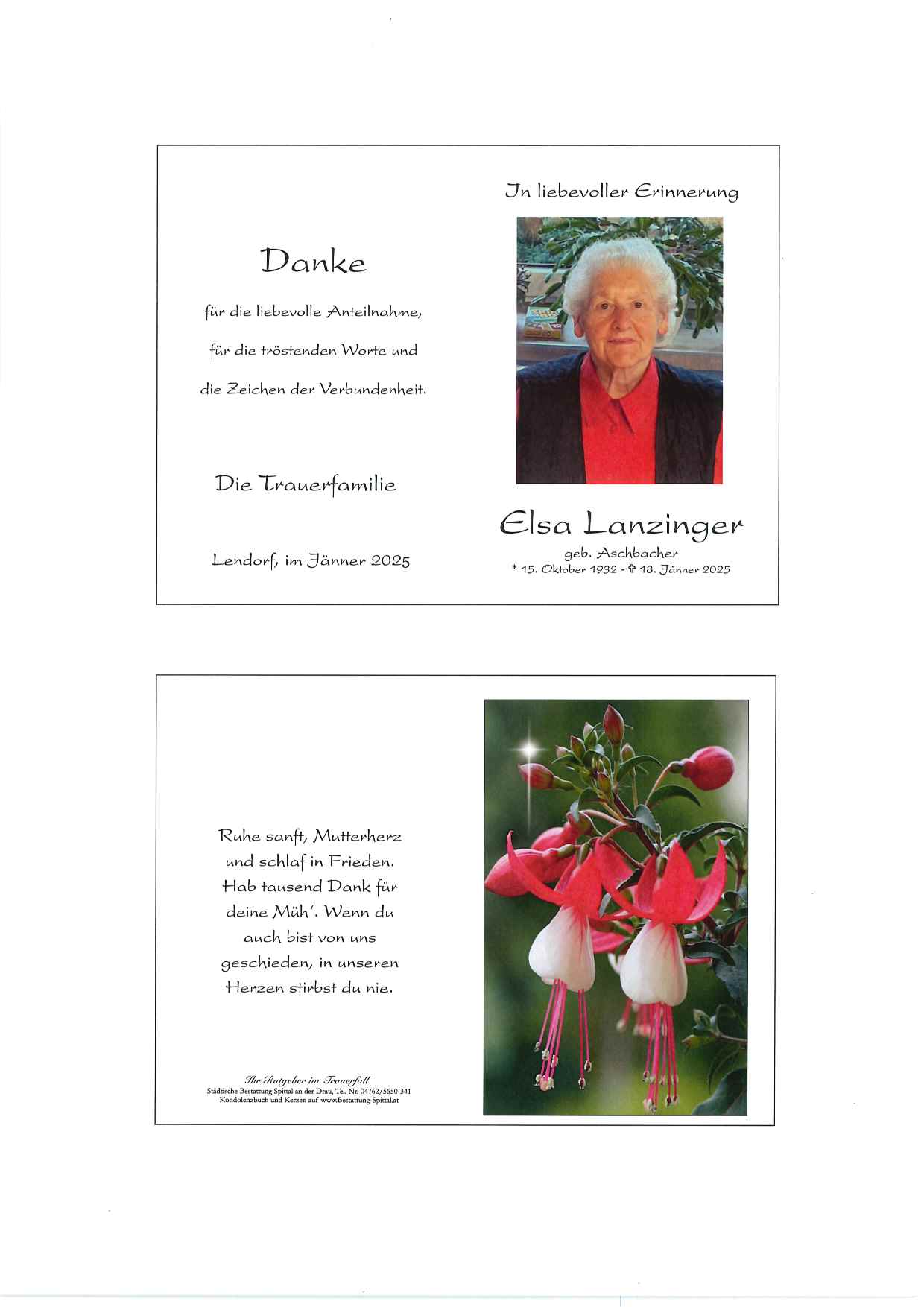 Bestattung wurde durchgeführt von: Gerald Baumgartner/Franz Kramaritsch/Sylvia Wippl Gerald Baumgartner/Franz Kramaritsch/Sylvia Wippl Städtische Bestattungsanstalt Spittal an der Drau Edlinger Straße 55 9800 - Spittal an der Drau Tel.: 04762 5650341 zum Bestatter