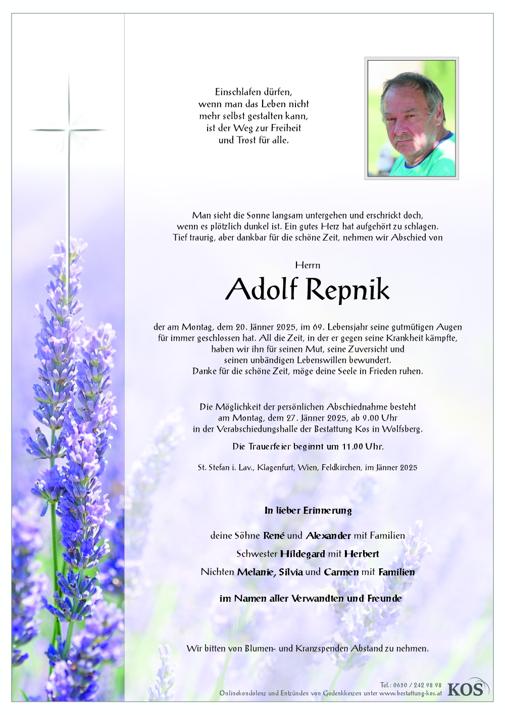 Bestattung wurde durchgeführt von: Familienbetrieb Bestattung Kos Bestattung A. & J. Kos GmbH Krankenhausstraße 2A 9400 - Wolfsberg Tel.: 0650 242 98 98 zum Bestatter