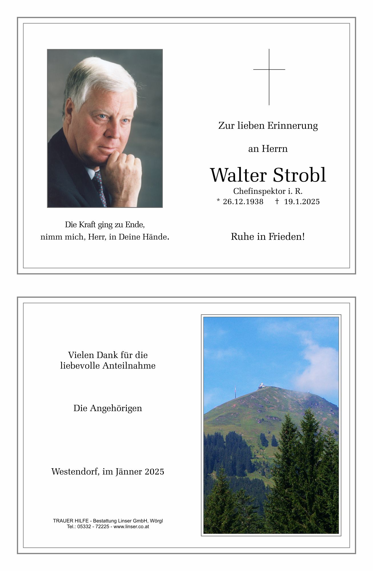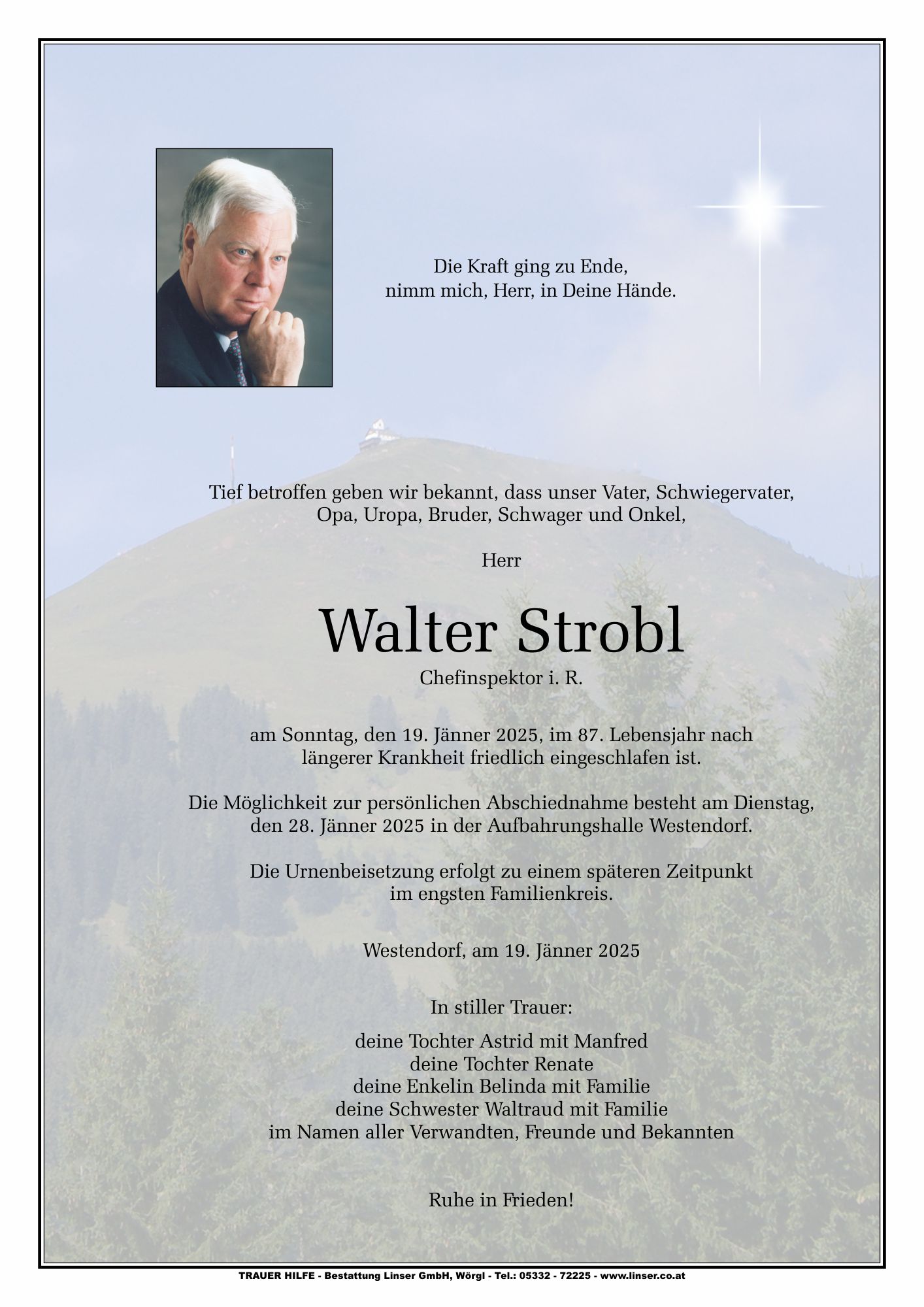 Bestattung wurde durchgeführt von: Walter Linser TrauerHilfe Bestattung Linser GmbH Wildschönauerstraße 41 6300 - Wörgl Tel.: 05332 72225 zum Bestatter