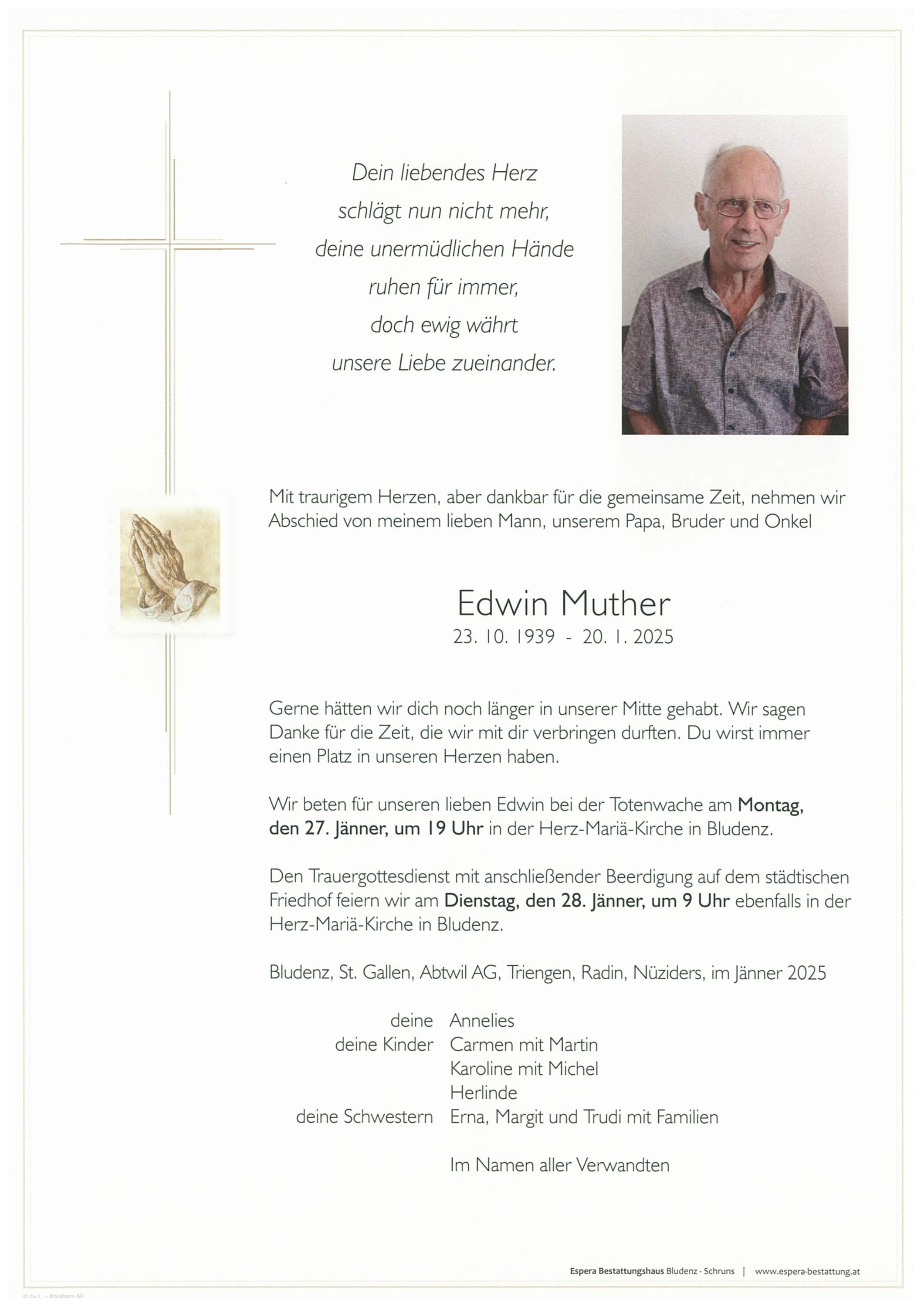 Bestattung wurde durchgeführt von: Espera Bestattungshaus Espera Sturnengasse 26 6700 - Bludenz Tel.: +43 5552 620790 zum Bestatter