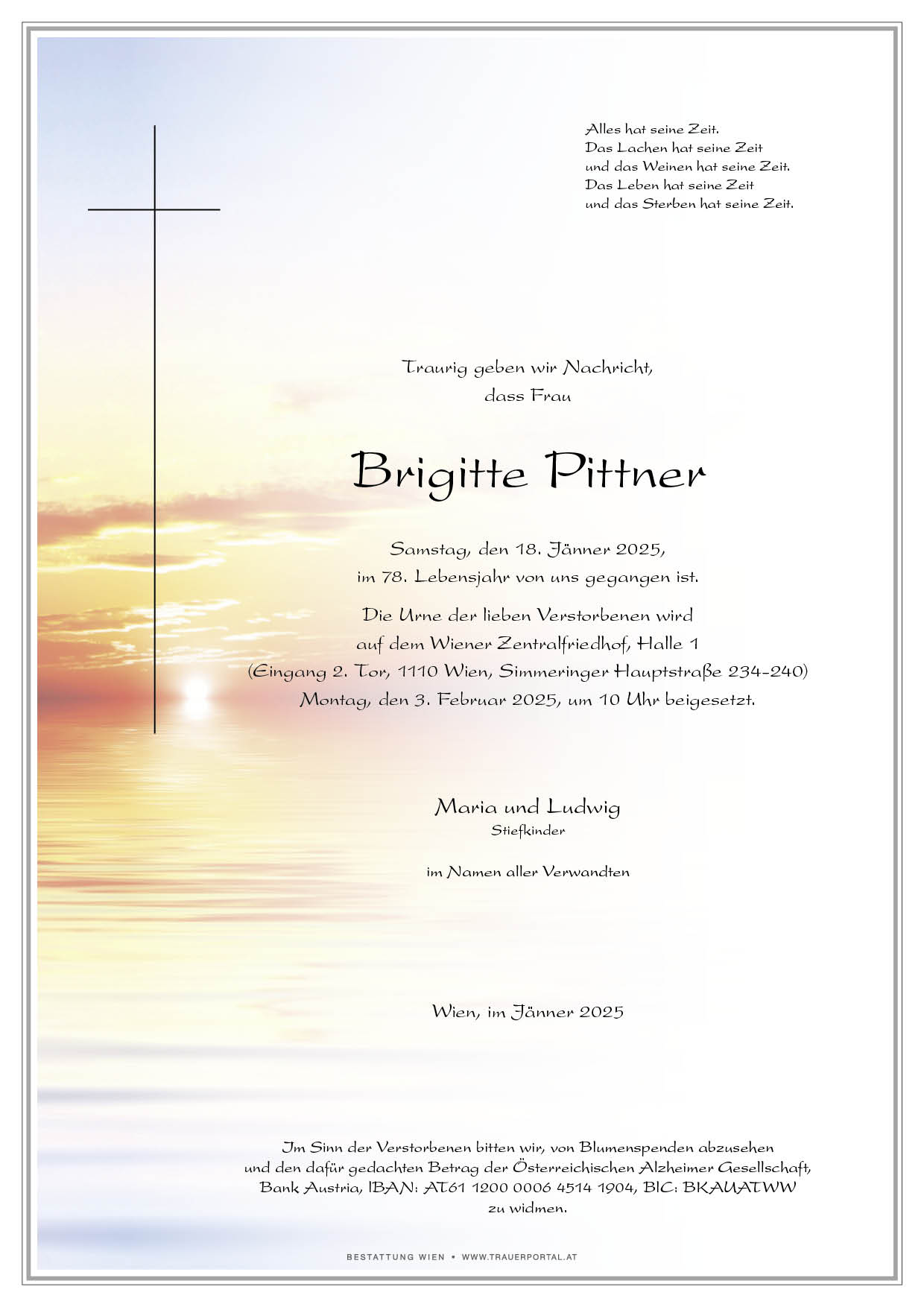 Bestattung wurde durchgeführt von: Bestattung Wien Bestattung Wien GmbH Simmeringer Hauptstraße 339 1110 - Wien (Simmering) Tel.: 01 501950 zum Bestatter