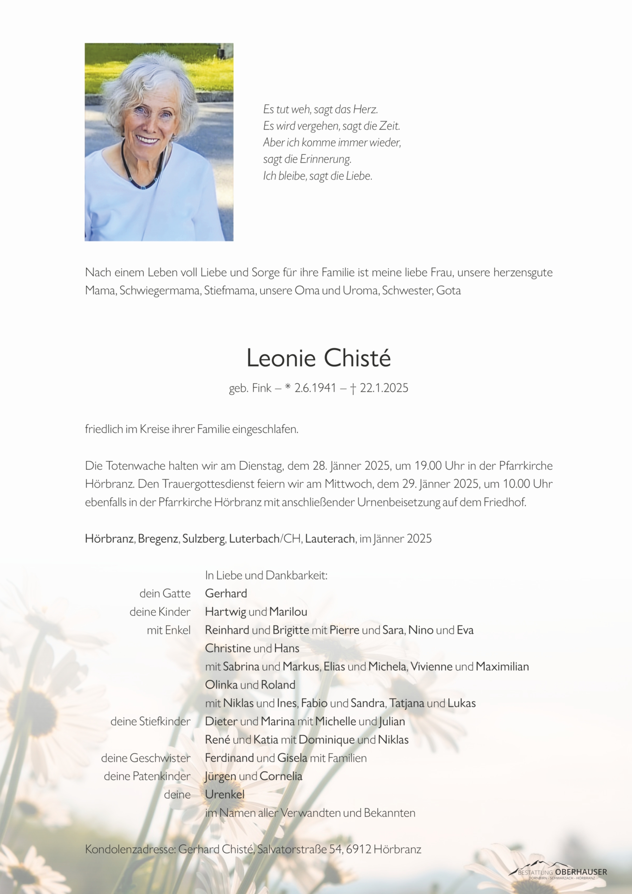 Bestattung wurde durchgeführt von: Carolin und Christoph Metzler Bestattung Oberhauser GesmbH Franz-Michael-Felder Straße 10 6850 - Dornbirn Tel.: 05572/20630 zum Bestatter