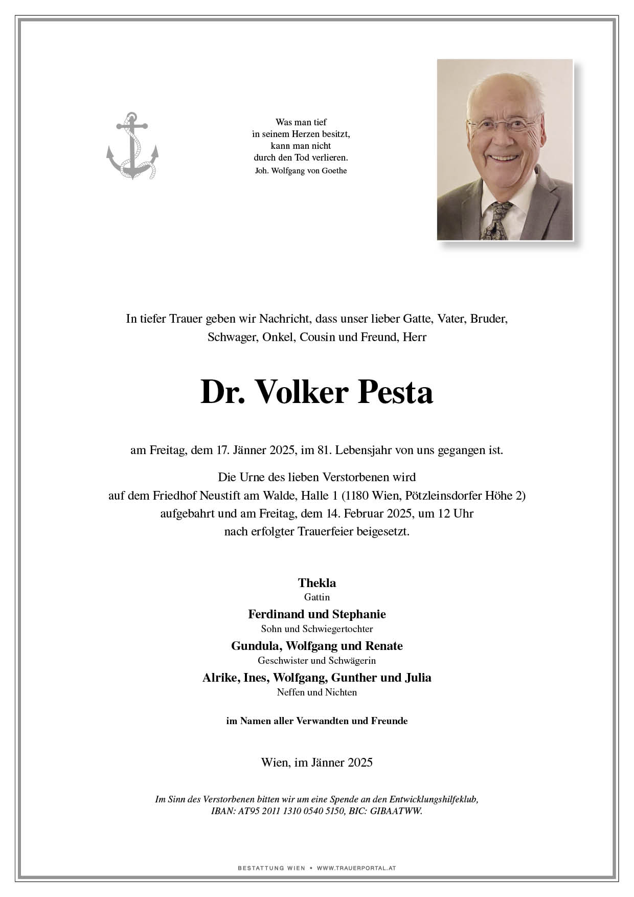 Bestattung wurde durchgeführt von: Bestattung Wien Bestattung Wien GmbH Simmeringer Hauptstraße 339 1110 - Wien (Simmering) Tel.: 01 501950 zum Bestatter