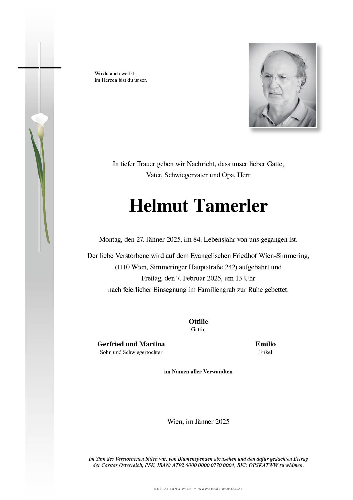 Bestattung wurde durchgeführt von: Bestattung Wien Bestattung Wien GmbH Simmeringer Hauptstraße 339 1110 - Wien (Simmering) Tel.: 01 501950 zum Bestatter