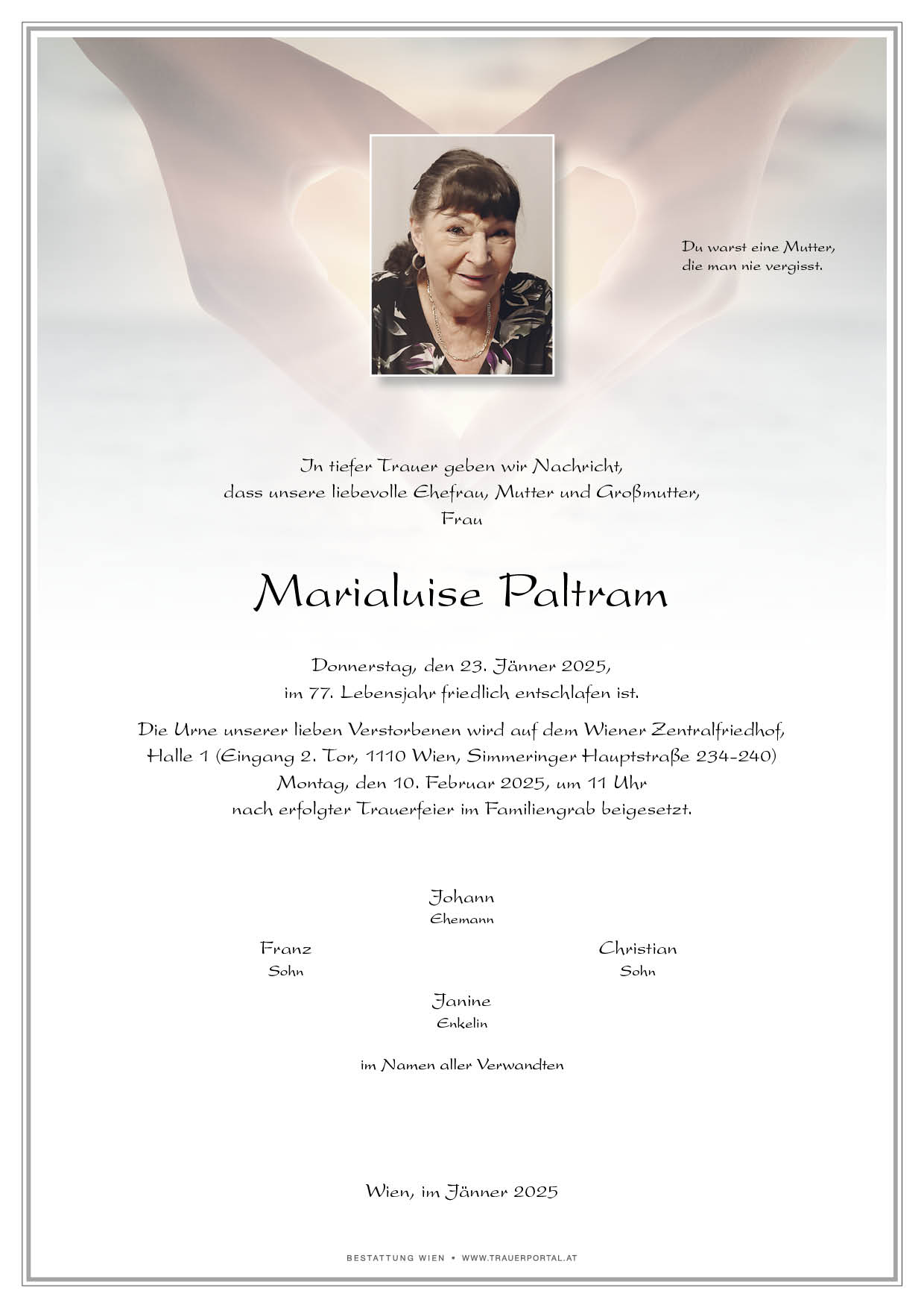 Bestattung wurde durchgeführt von: Bestattung Wien Bestattung Wien GmbH Simmeringer Hauptstraße 339 1110 - Wien (Simmering) Tel.: 01 501950 zum Bestatter