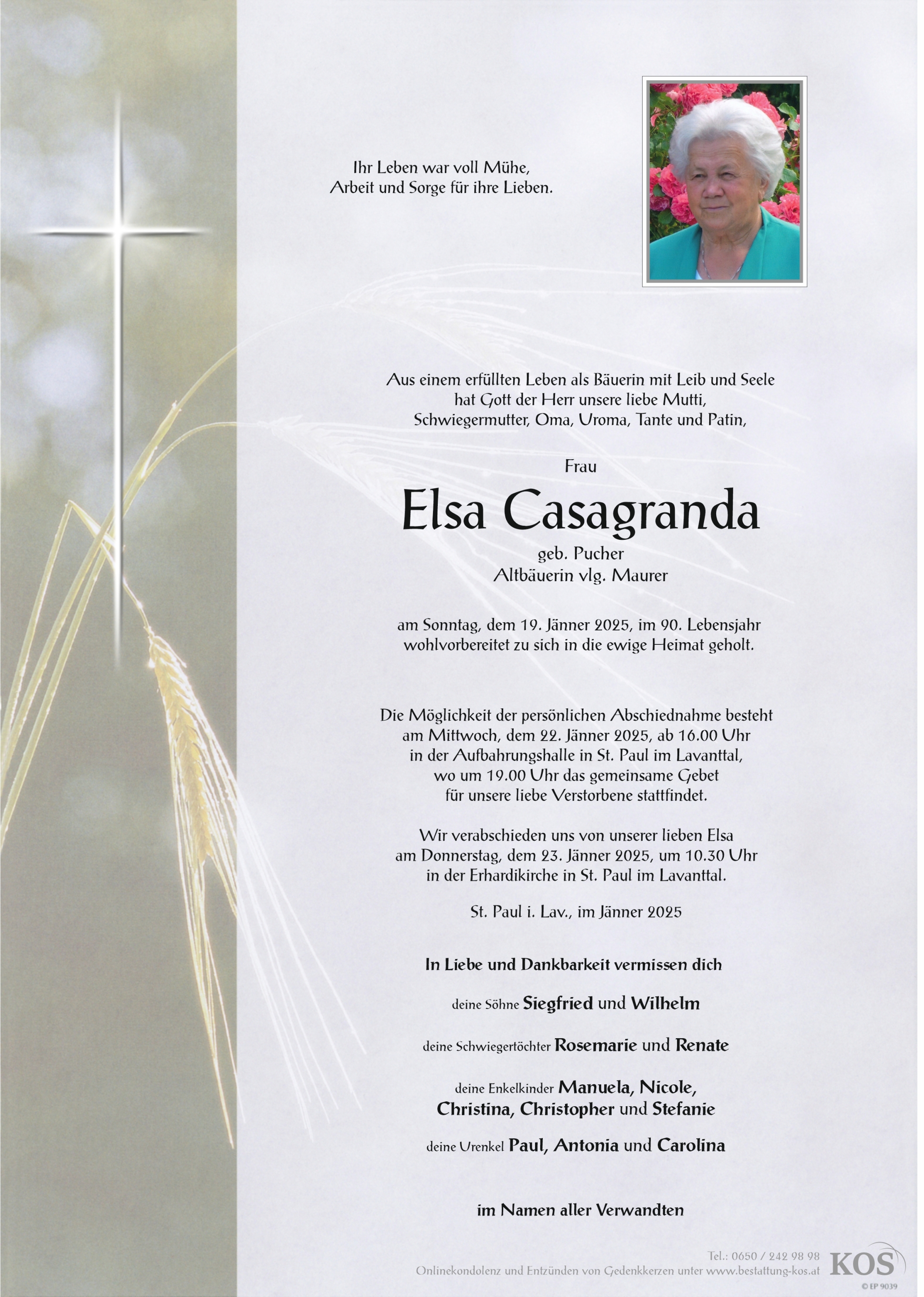 Bestattung wurde durchgeführt von: Familienbetrieb Bestattung Kos Bestattung A. & J. Kos GmbH Krankenhausstraße 2A 9400 - Wolfsberg Tel.: 0650 242 98 98 zum Bestatter