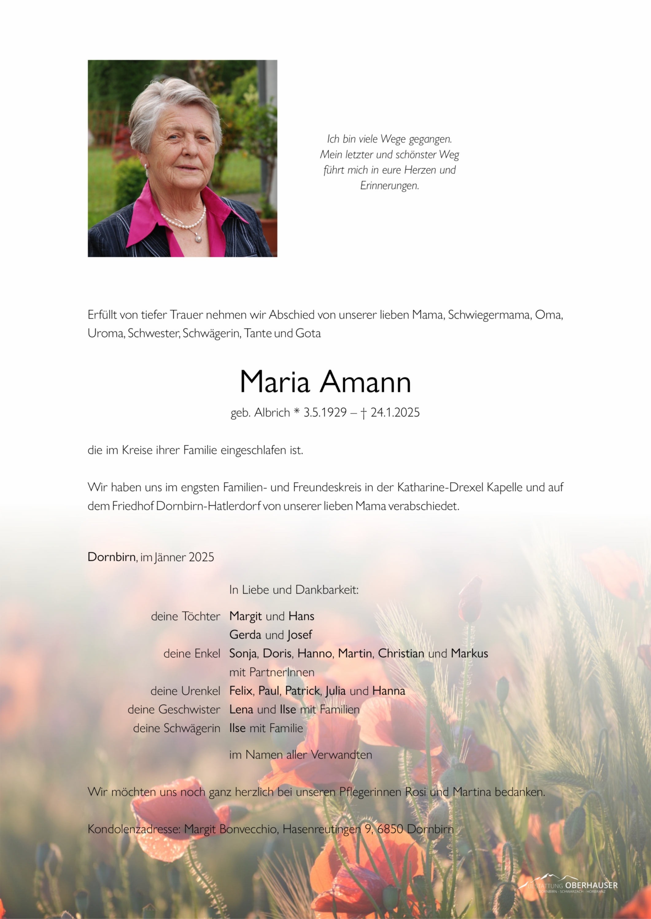 Bestattung wurde durchgeführt von: Carolin und Christoph Metzler Bestattung Oberhauser GesmbH Franz-Michael-Felder Straße 10 6850 - Dornbirn Tel.: 05572/20630 zum Bestatter