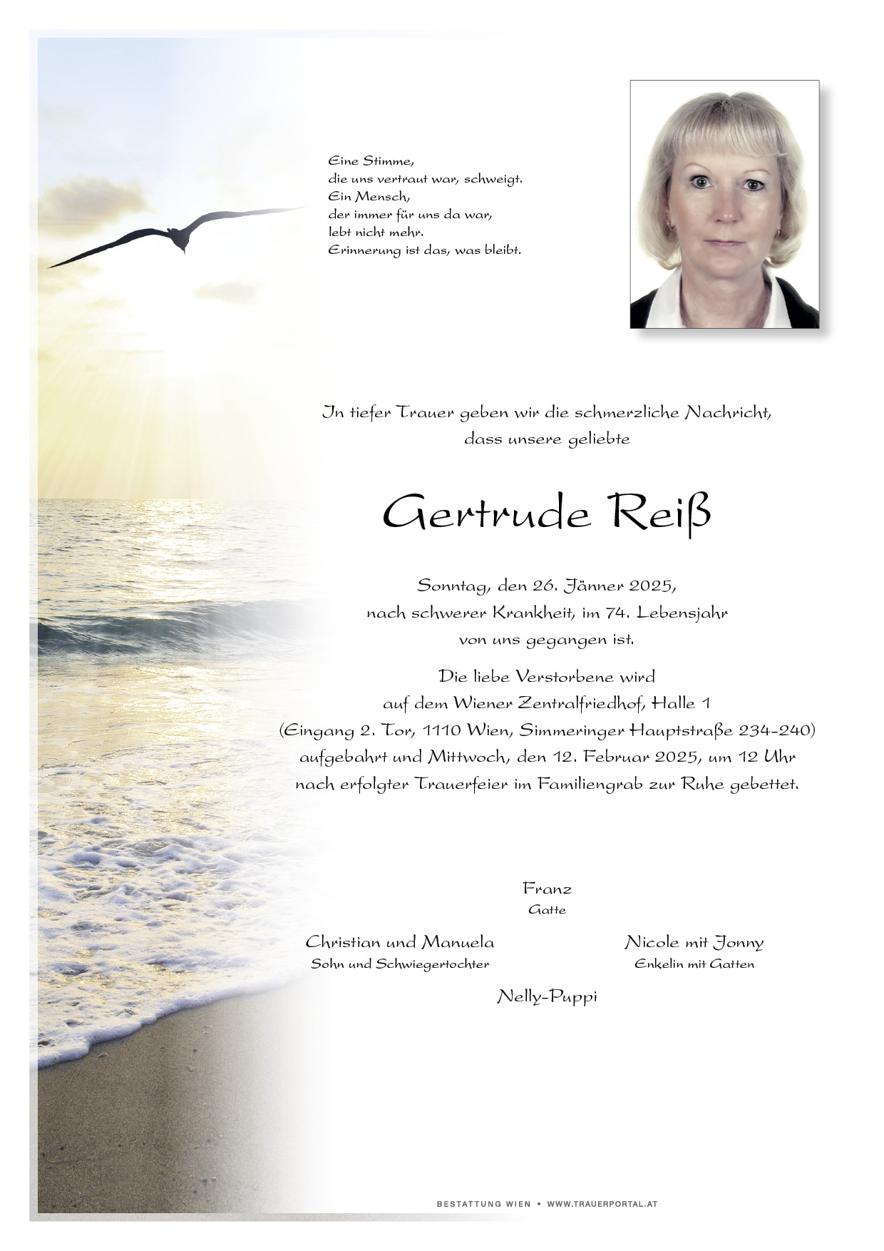 Bestattung wurde durchgeführt von: Bestattung Wien Bestattung Wien GmbH Simmeringer Hauptstraße 339 1110 - Wien (Simmering) Tel.: 01 501950 zum Bestatter