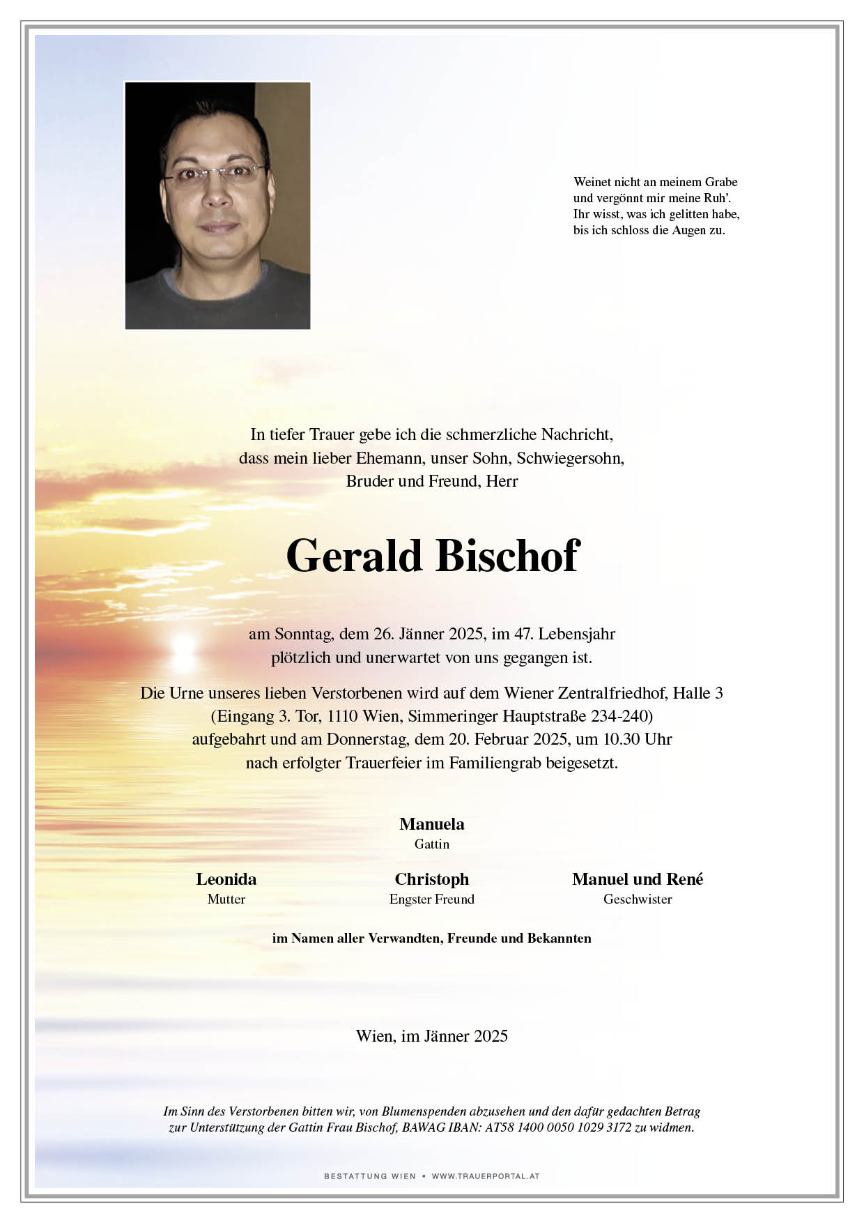 Bestattung wurde durchgeführt von: Bestattung Wien Bestattung Wien GmbH Simmeringer Hauptstraße 339 1110 - Wien (Simmering) Tel.: 01 501950 zum Bestatter