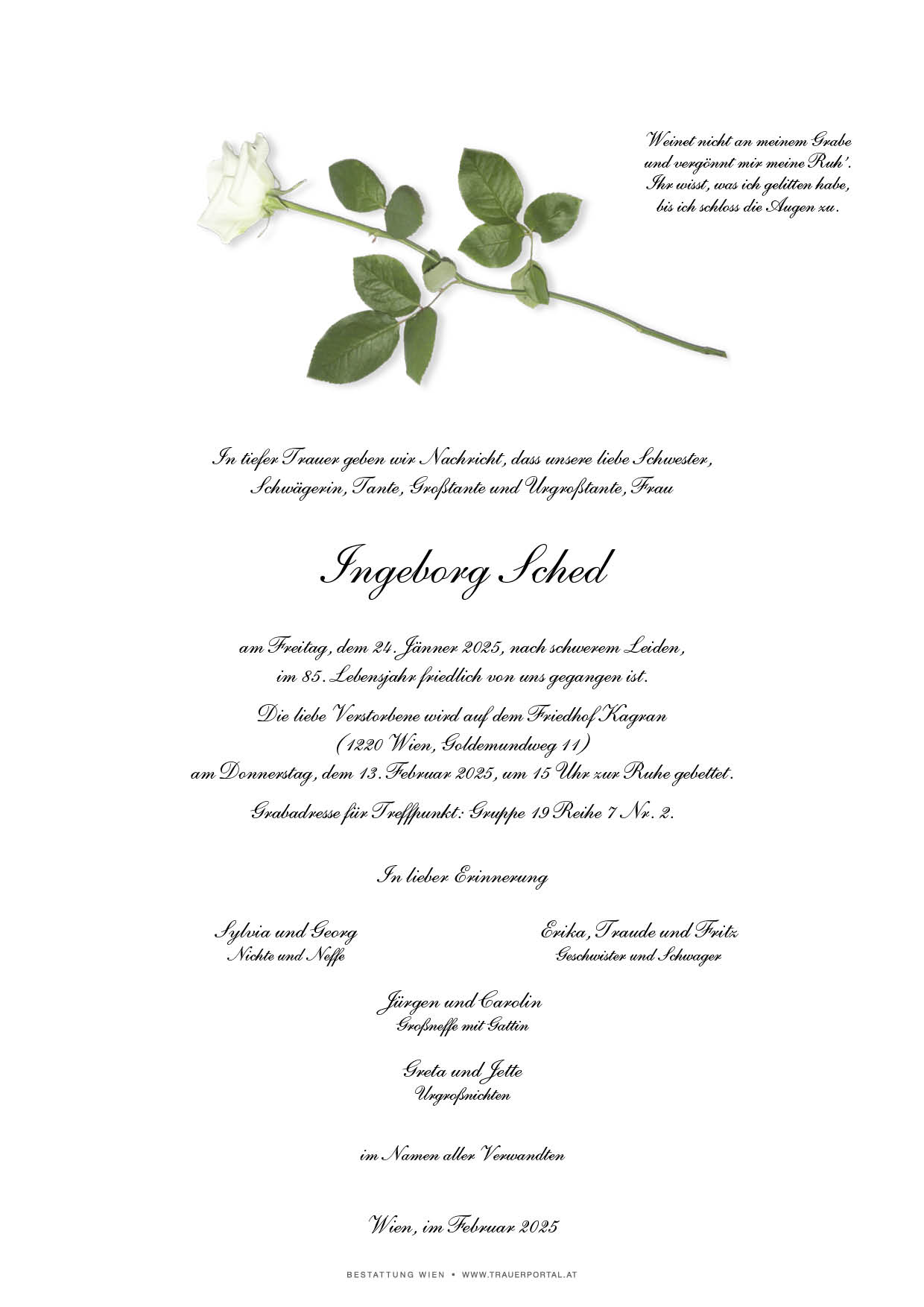 Bestattung wurde durchgeführt von: Bestattung Wien Bestattung Wien GmbH Simmeringer Hauptstraße 339 1110 - Wien (Simmering) Tel.: 01 501950 zum Bestatter