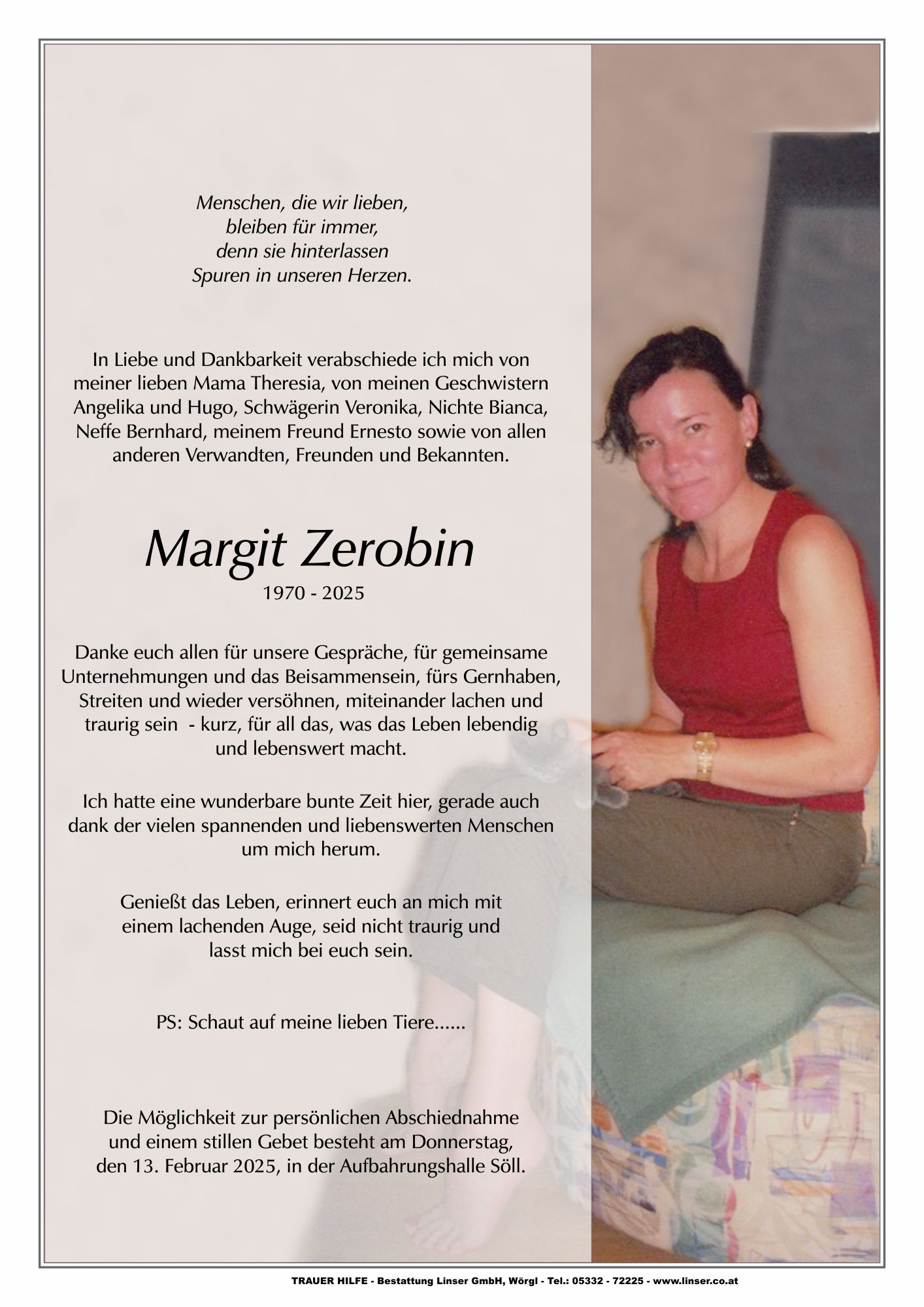 Bestattung wurde durchgeführt von: Walter Linser TrauerHilfe Bestattung Linser GmbH Wildschönauerstraße 41 6300 - Wörgl Tel.: 05332 72225 zum Bestatter