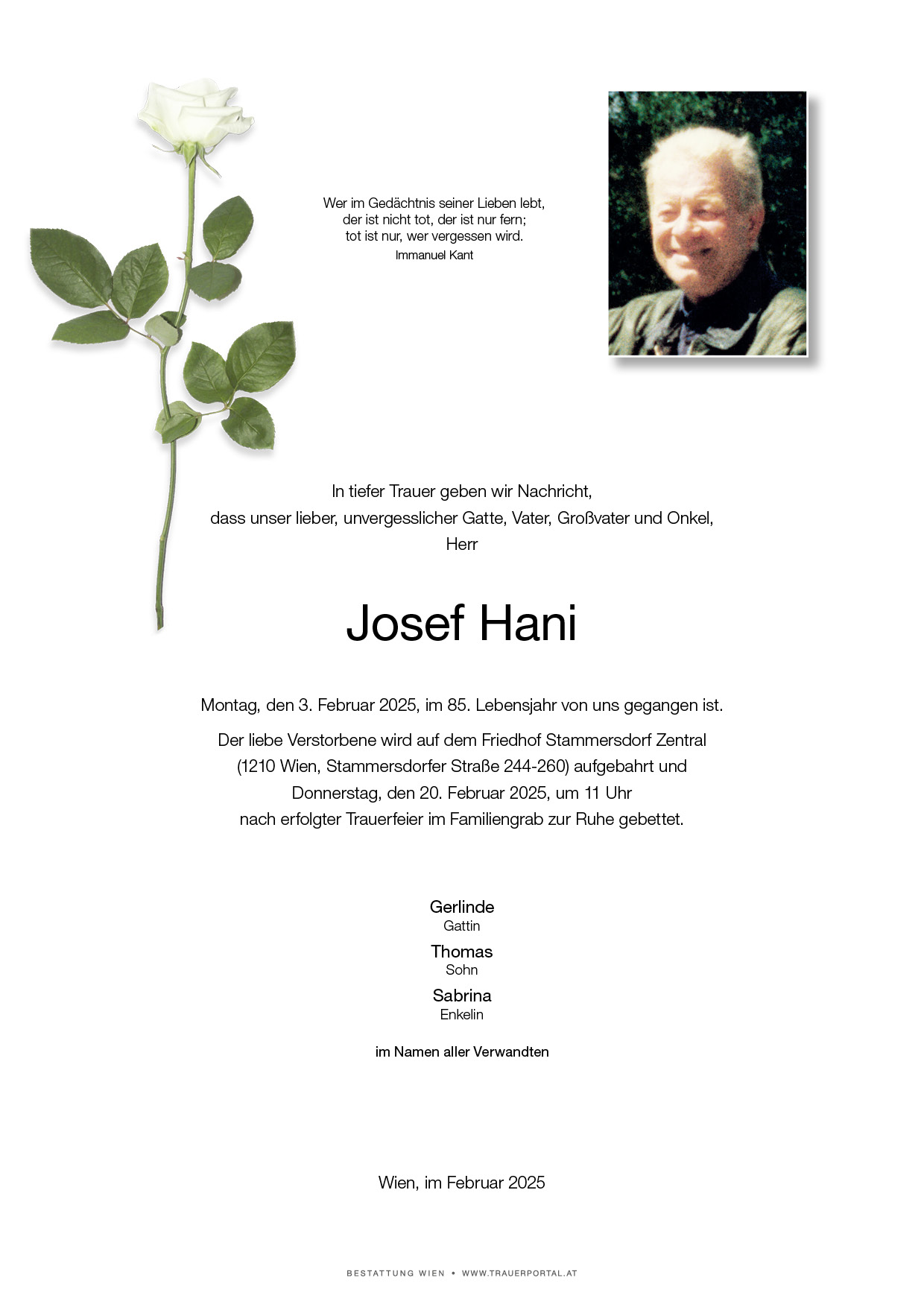 Bestattung wurde durchgeführt von: Bestattung Wien Bestattung Wien GmbH Simmeringer Hauptstraße 339 1110 - Wien (Simmering) Tel.: 01 501950 zum Bestatter