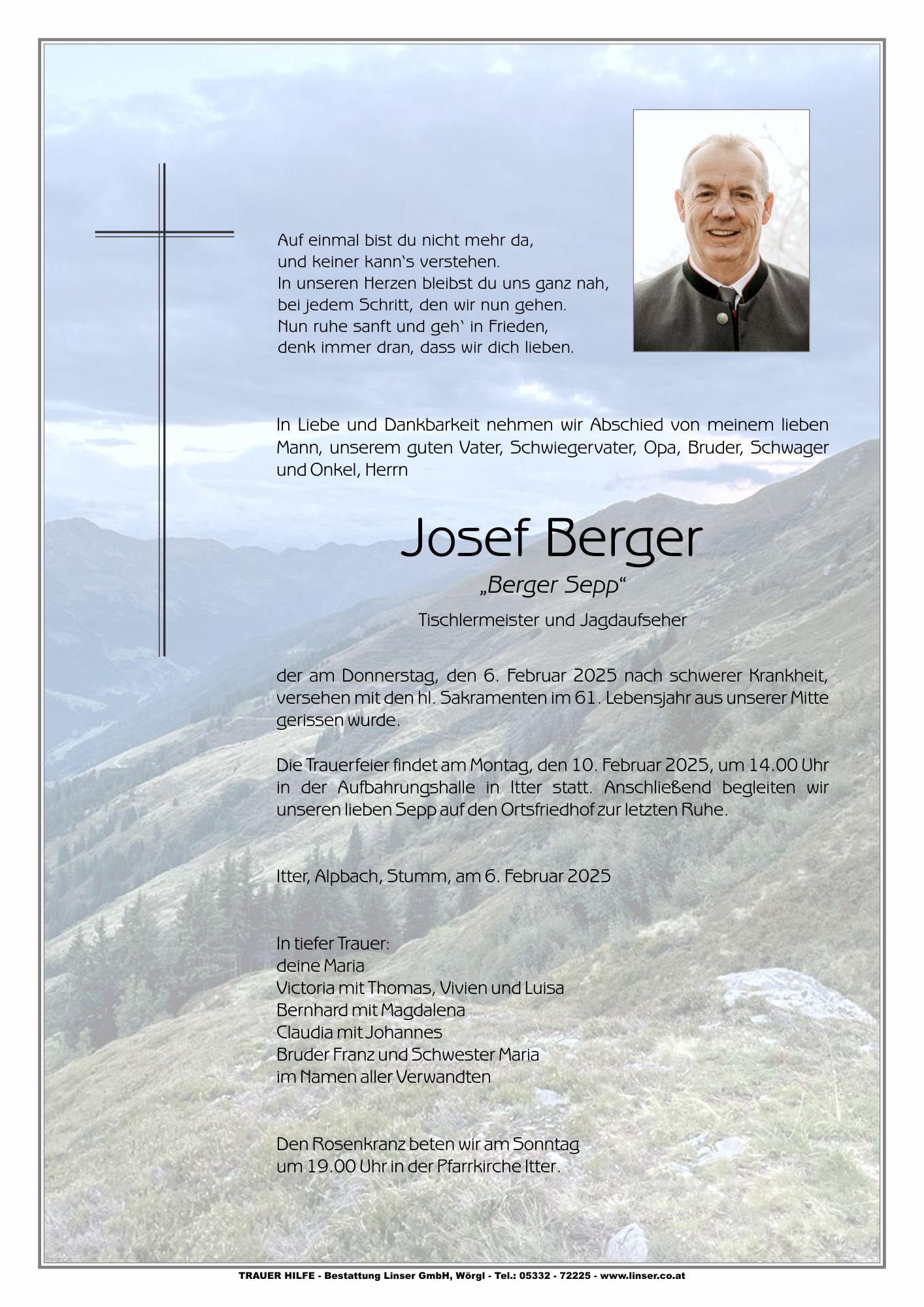 Bestattung wurde durchgeführt von: Walter Linser TrauerHilfe Bestattung Linser GmbH Wildschönauerstraße 41 6300 - Wörgl Tel.: 05332 72225 zum Bestatter