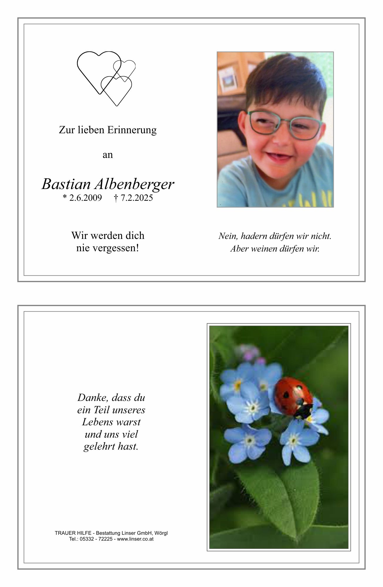 Lieber Bastian, du wirst immer ein Teil von mir und meiner Familie sein. Auch wenn wir in letzter Zeit nicht mehr so viel Zeit miteinander verbringen konnten, vermisse dich unendlich. Ich gönne dir aber die Ruhe und den Frieden den du jetzt hast.