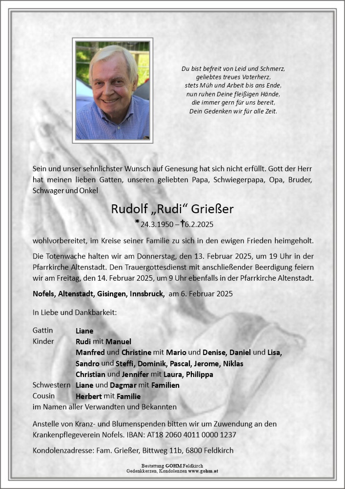 Bestattung wurde durchgeführt von: Martin Gohm Martin Gohm Bestattung Gohm Schregenbergstraße 5 6800 - Feldkirch Tel.: 05522 76071 zum Bestatter