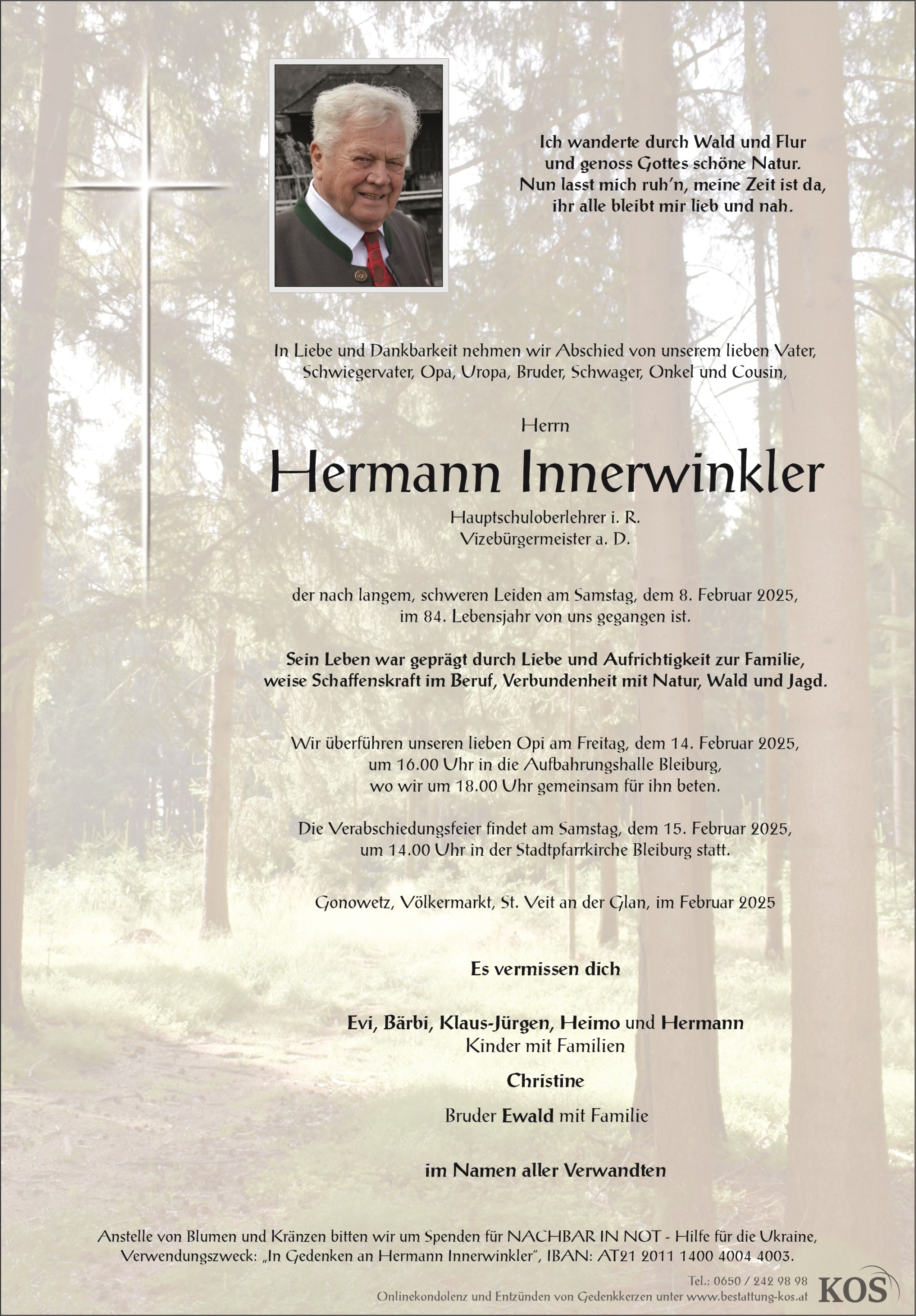 Bestattung wurde durchgeführt von: Familienbetrieb Bestattung Kos Bestattung A. & J. Kos GmbH Krankenhausstraße 2A 9400 - Wolfsberg Tel.: 0650 242 98 98 zum Bestatter