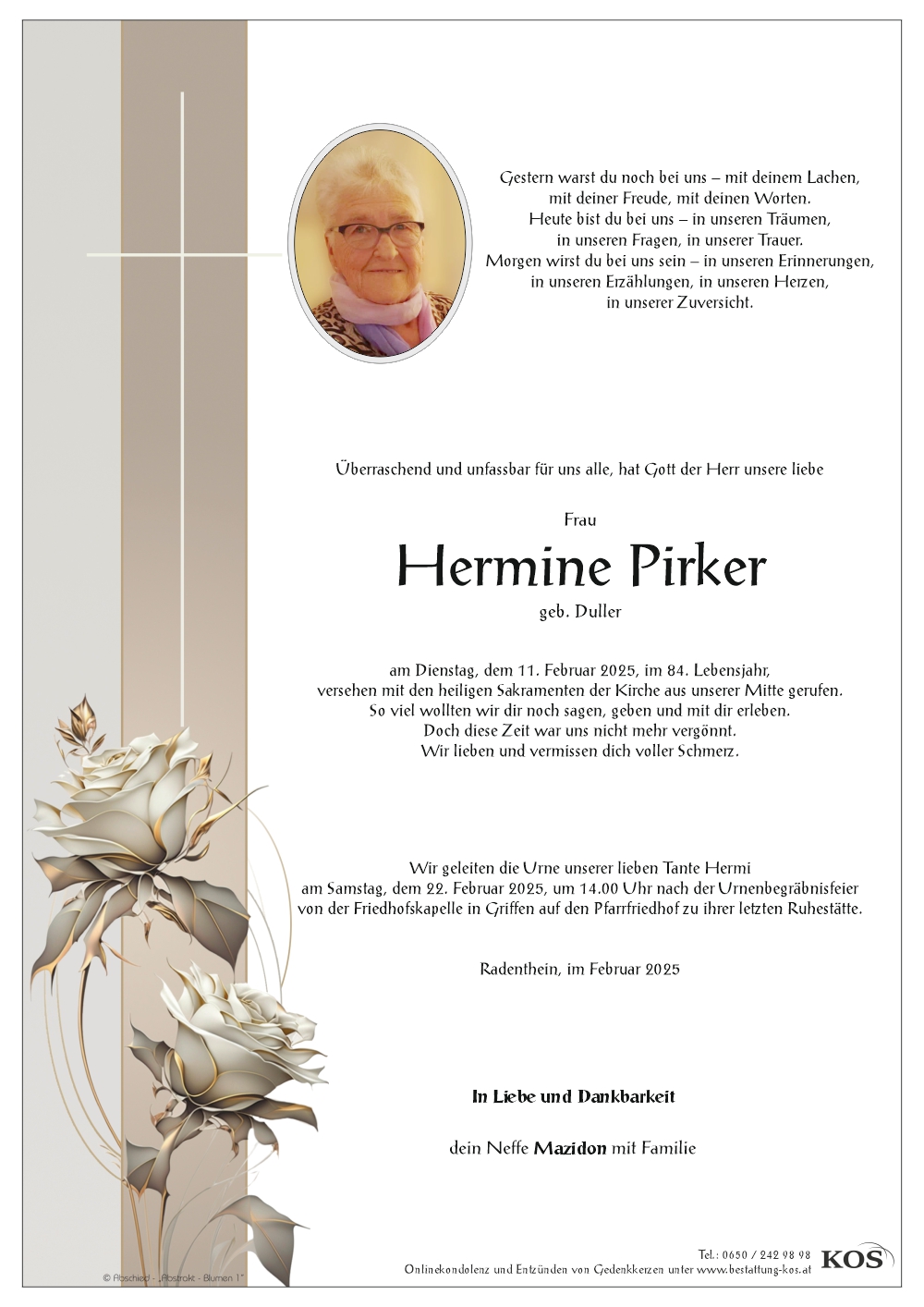 Bestattung wurde durchgeführt von: Familienbetrieb Bestattung Kos Bestattung A. & J. Kos GmbH Krankenhausstraße 2A 9400 - Wolfsberg Tel.: 0650 242 98 98 zum Bestatter