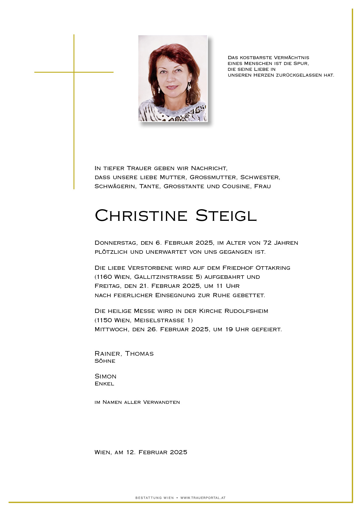 Bestattung wurde durchgeführt von: Bestattung Wien Bestattung Wien GmbH Simmeringer Hauptstraße 339 1110 - Wien (Simmering) Tel.: 01 501950 zum Bestatter