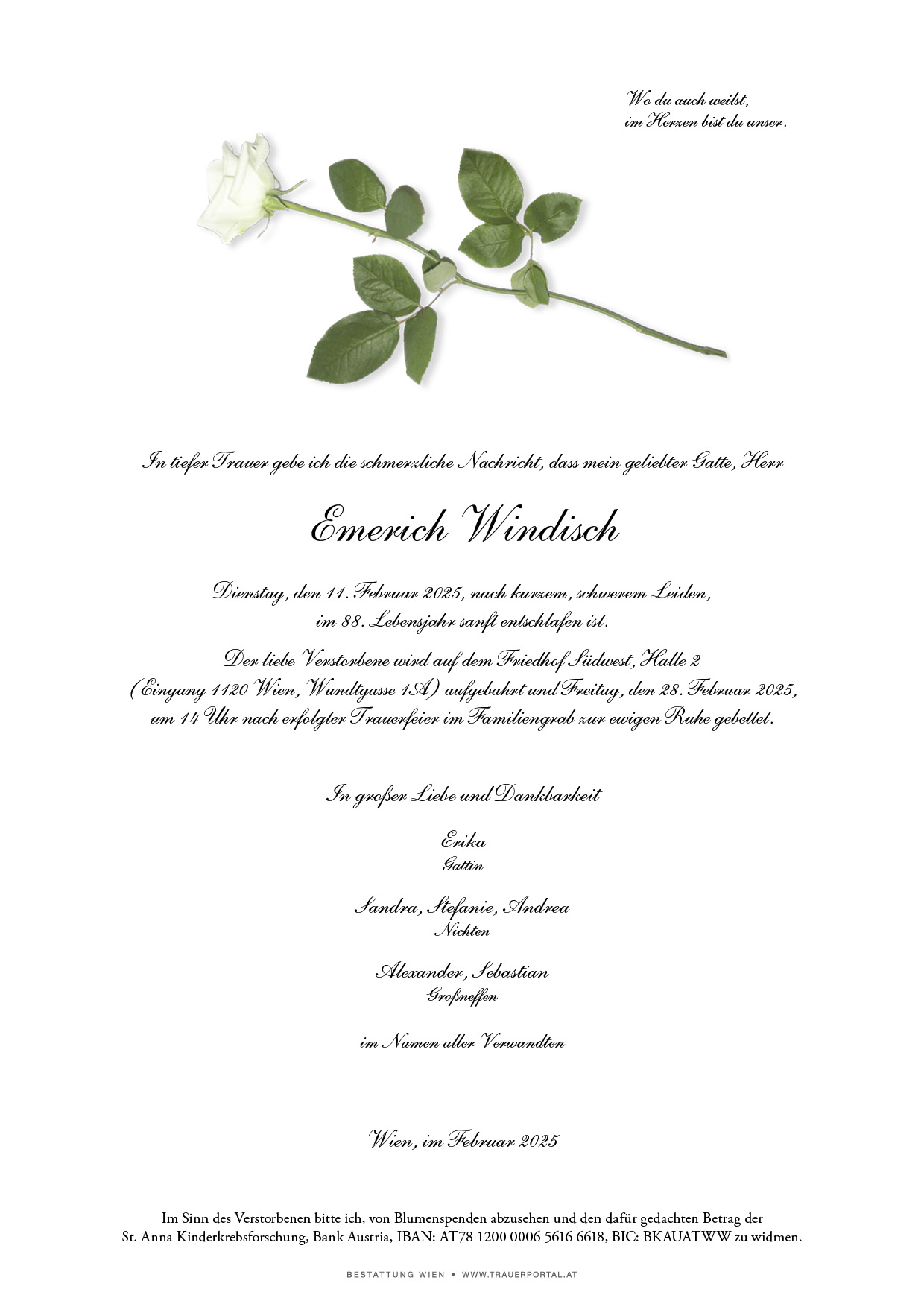 Bestattung wurde durchgeführt von: Bestattung Wien Bestattung Wien GmbH Simmeringer Hauptstraße 339 1110 - Wien (Simmering) Tel.: 01 501950 zum Bestatter