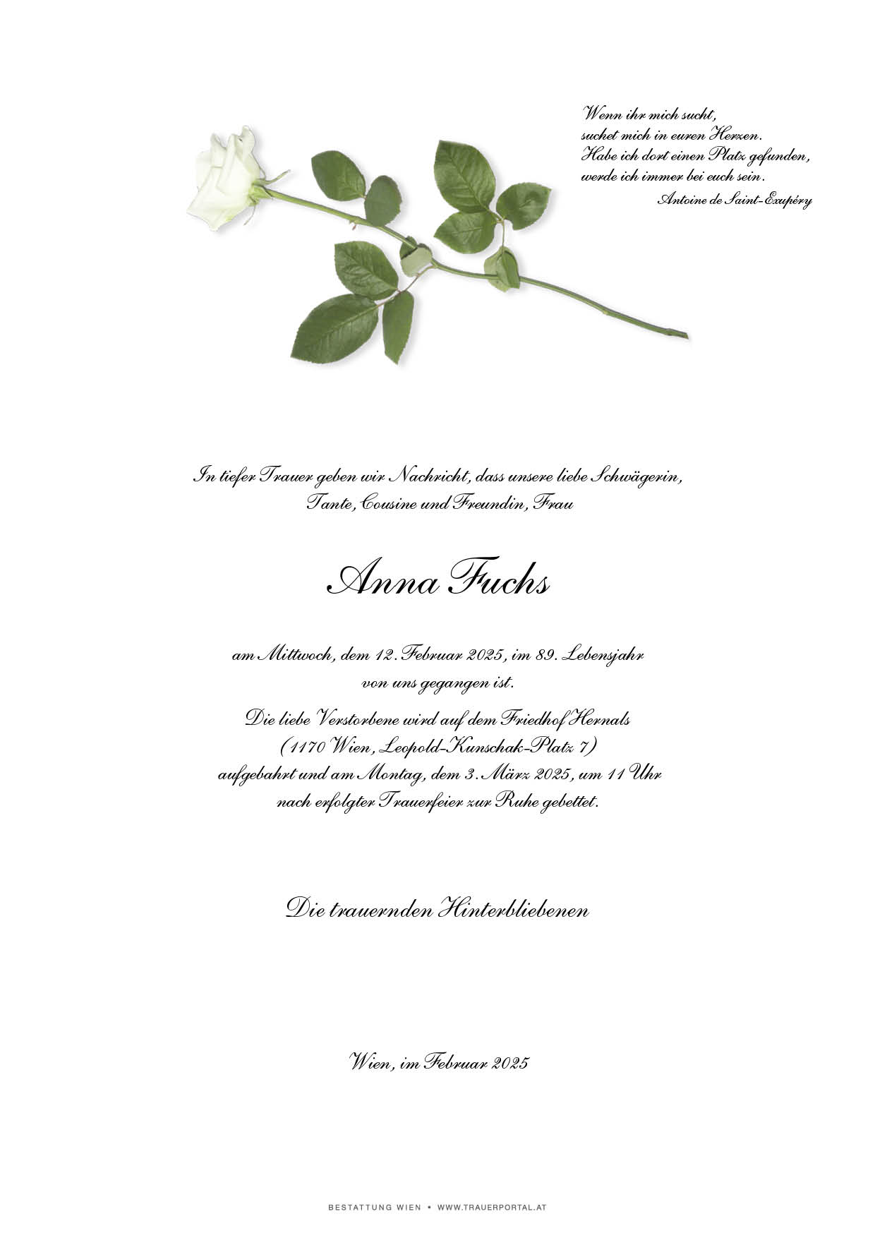 Bestattung wurde durchgeführt von: Bestattung Wien Bestattung Wien GmbH Simmeringer Hauptstraße 339 1110 - Wien (Simmering) Tel.: 01 501950 zum Bestatter